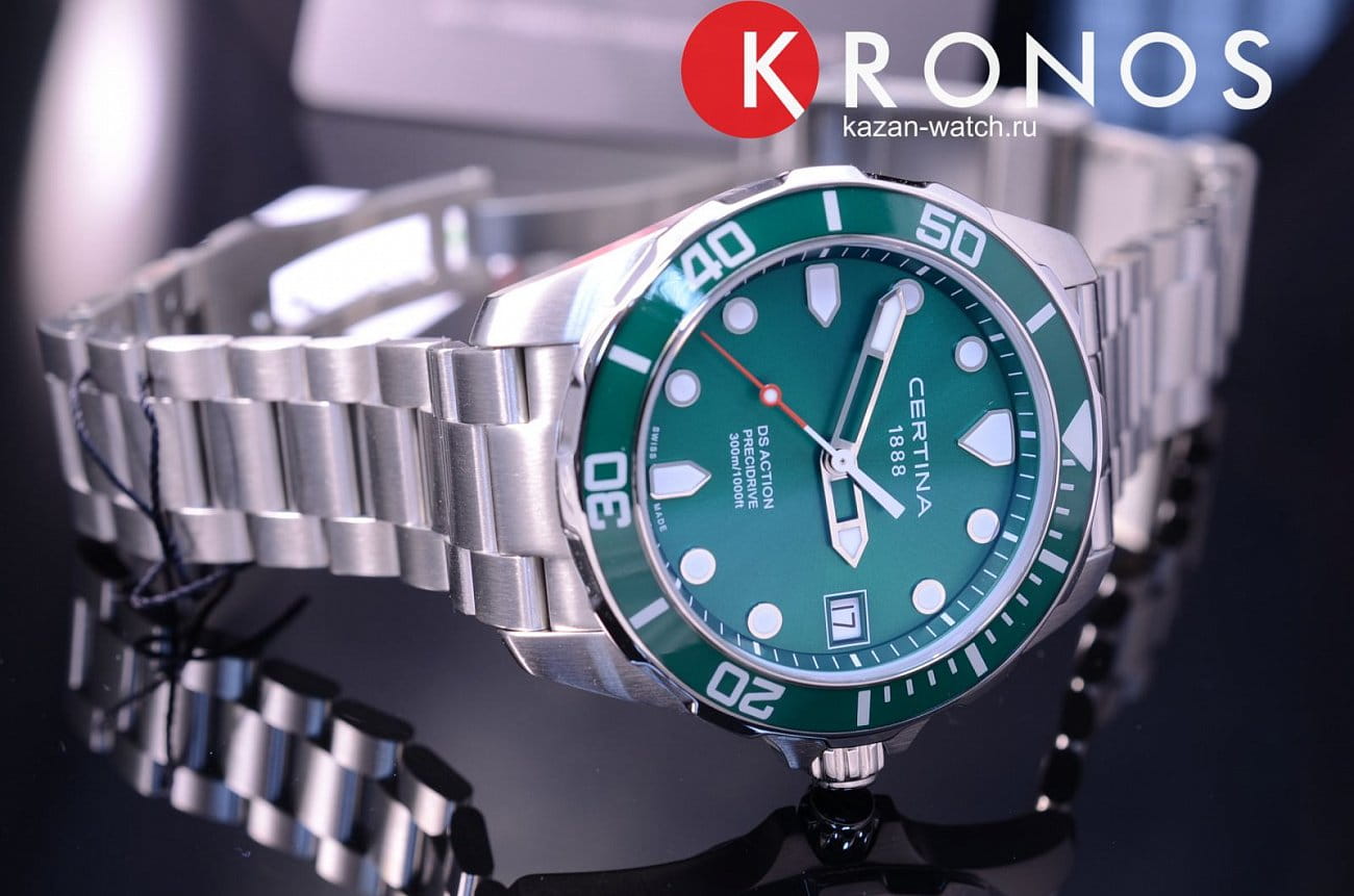 Часы отражают концепцию долговечности и практичности, использование инновационных материалов и высокоточного швейцарского калибра ETA F07.411 Precidrive™Precidrive™Инновационный кварцевый механизм Certina. Часы, оснащённые этим швейцарским калибром, приравниваются к точности к сертифицированным хронометрам, точность хода составляет +/-10 секунд в год. позволяет часам стильно выглядеть и сохранять безупречную работоспособность. Ударопрочный корпусУдаропрочный корпусМеханизм заключён в корпус, выполненный из современных материалов, устойчивых к ударам, механическим повреждениям и падению с высоты: инновационный пластик, карбон, нержавеющая сталь, титан. и браслет из стали, устойчивой к царапинам и повреждениям. Сапфировое стекло. Система Double SecurityDS ConceptDouble Security Concept, обозначает двойную надёжность и безупречную точность часов Certina. Двойная система защиты подразумевает обеспечение максимальной устойчивости к ударам и высоких показателей водонепроницаемости.. Вращающийся безельБезельВнешний ободок, закрепляющий стекло. В спортивных часах так называется поворотное кольцо с делениями на циферблате, выполняет роль таймера – замеряет отрезки времени на шкале. Неподвижный безель – элемент декора. Однонаправленно вращающийся безель на дайверских часах позволяет фиксировать моменты погружения и выныривания на поверхность.. Водонепроницаемость WR 300. Апертура даты, функция EOLEOLПредставляет собой систему, уведомляющую владельца часов о необходимости замены элемента питания. За 2 недели до полного разряда батарейки секундная стрелка перестаёт ходить чётко и начинает перепрыгивать на 3-4 деления.. «Умная» застёжка с удлинением для дайверовУдлинение для дайверовЗастёжка с удлинением для дайверов представляет собой безопасное крепление, которое позволяет надевать часы поверх гидрокостюма. Гибкая застёжка удлиняется на 1-2 миллиметра.. Диаметр корпуса: 41 мм.