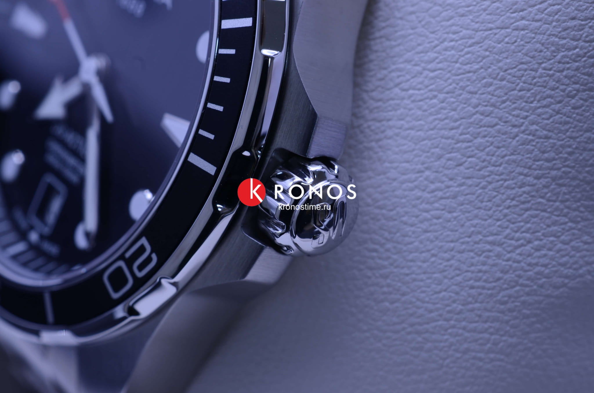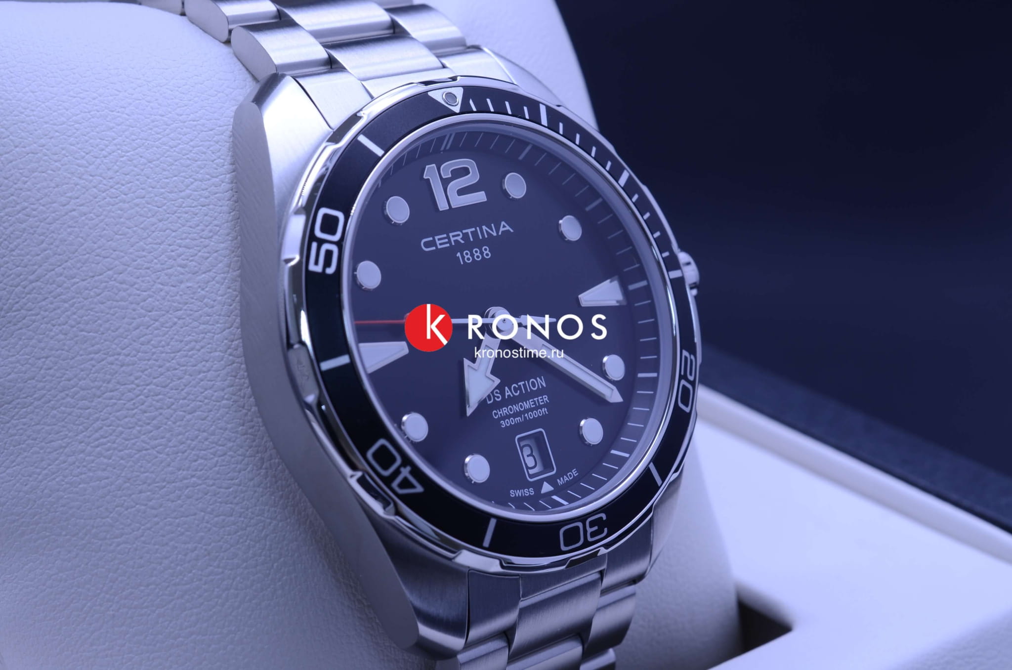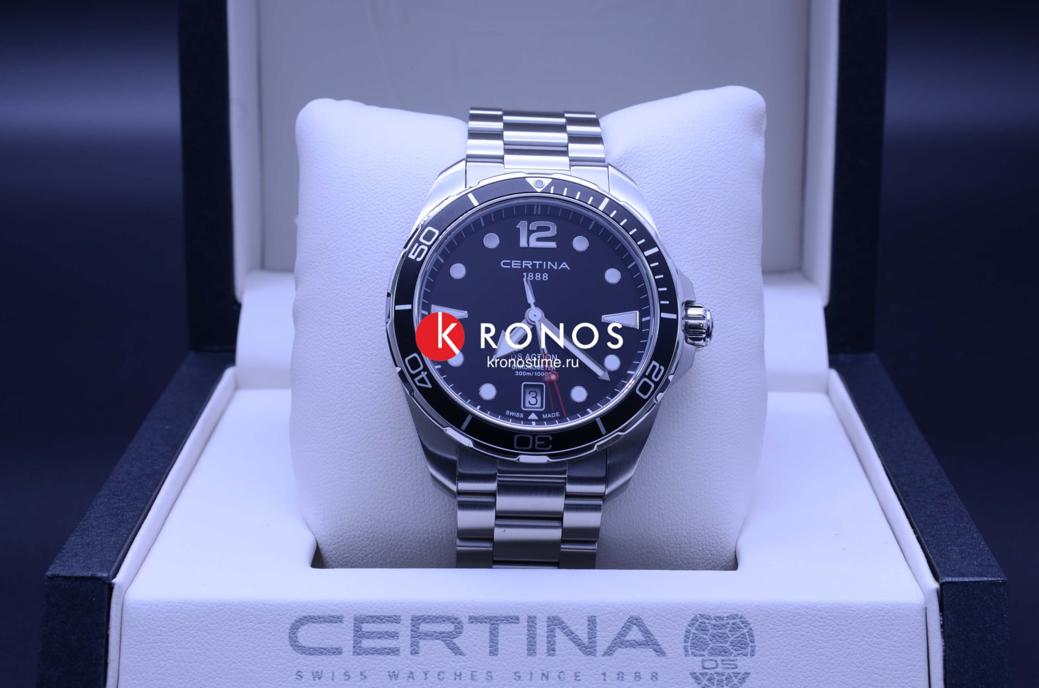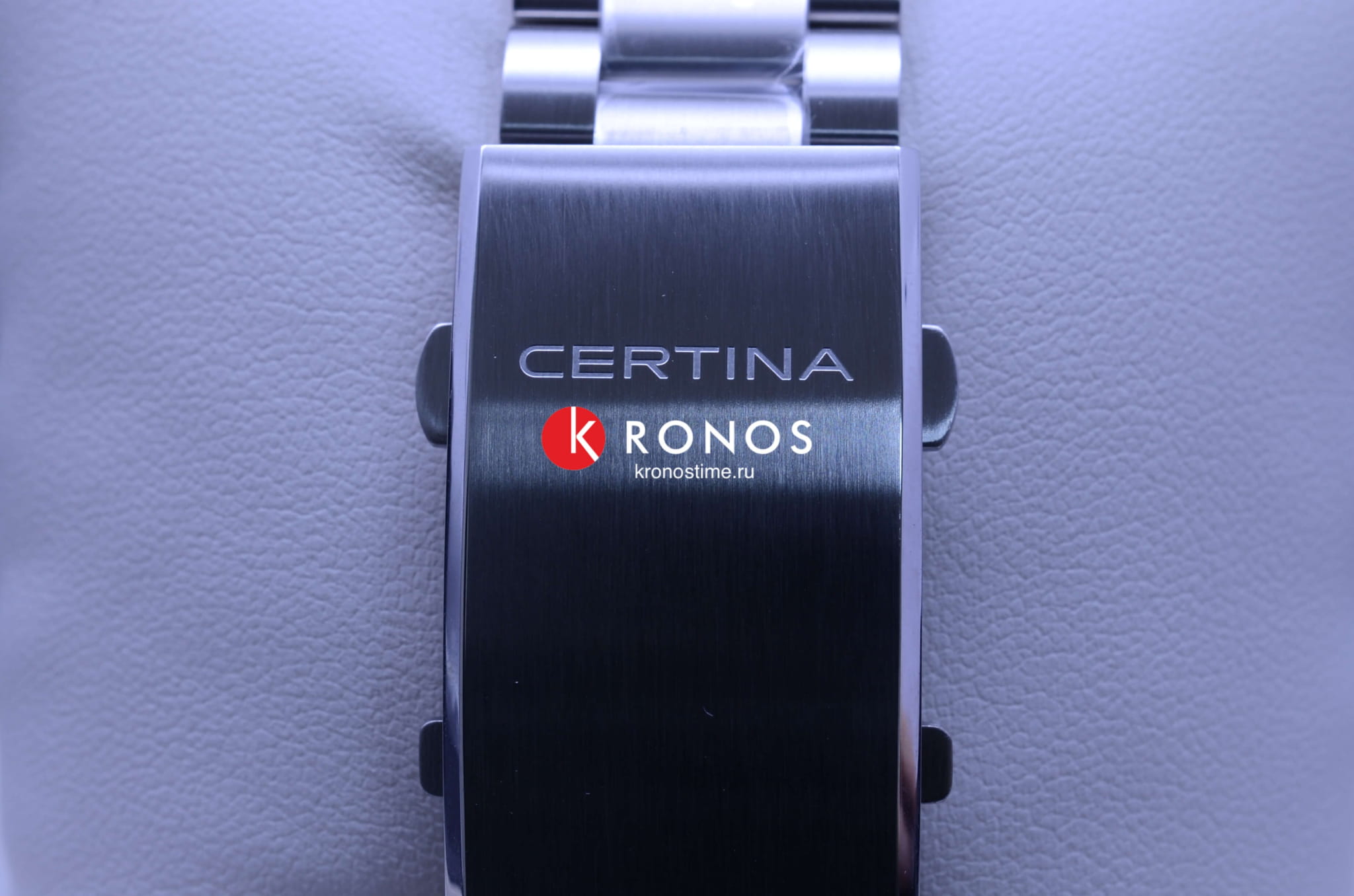 Это превосходная модель в серебристо-чёрной расцветке для тех, кто не готов соглашаться на меньшее. Наручные часы отличаются безупречными характеристиками по всем параметрам: ударопрочный корпусУдаропрочный корпусМеханизм заключён в корпус, выполненный из современных материалов, устойчивых к ударам, механическим повреждениям и падению с высоты: инновационный пластик, карбон, нержавеющая сталь, титан. из хирургической стали 316L, устойчивое к царапинам сапфировое стекло с антибликовой поверхностью, водостойкость до 30 бар, повышенная точность хода кварцевого швейцарского калибра ETA F07.412 Precidrive™Precidrive™Инновационный кварцевый механизм Certina. Часы, оснащённые этим швейцарским калибром, приравниваются к точности к сертифицированным хронометрам, точность хода составляет +/-10 секунд в год., подтверждённая сертификатом COSCСертификат COSCОфициальный сертификат, подтверждающий то, что часы ходят с особо высокой точностью. Для получения документа часы подвергаются тестовым испытаниям, разработанным швейцарским институтом тестирования хронометров COSC. Допустимая норма для механических часов -4/+6 секунд в день, для кварцевых моделей +/- 0,07 секунд в день.. Алюминиевый вращающийся безельБезельВнешний ободок, закрепляющий стекло. В спортивных часах так называется поворотное кольцо с делениями на циферблате, выполняет роль таймера – замеряет отрезки времени на шкале. Неподвижный безель – элемент декора. Однонаправленно вращающийся безель на дайверских часах позволяет фиксировать моменты погружения и выныривания на поверхность.. Закручивающиеся кнопки, заводная головка с системой защиты, задняя крышка. Индикатор EOLEOLПредставляет собой систему, уведомляющую владельца часов о необходимости замены элемента питания. За 2 недели до полного разряда батарейки секундная стрелка перестаёт ходить чётко и начинает перепрыгивать на 3-4 деления.. Апертура даты. Застёжка с фиксатором и удлинением для дайверовУдлинение для дайверовЗастёжка с удлинением для дайверов представляет собой безопасное крепление, которое позволяет надевать часы поверх гидрокостюма. Гибкая застёжка удлиняется на 1-2 миллиметра.. Диаметр корпуса: 43 мм.