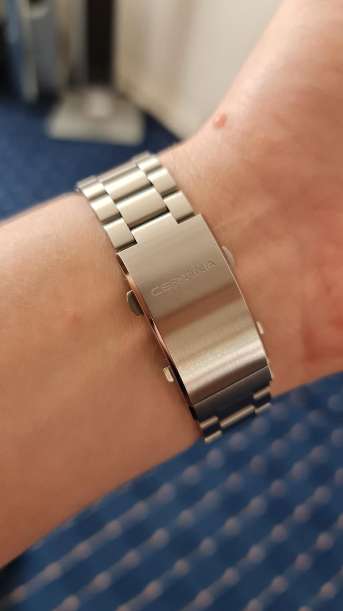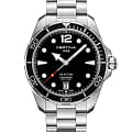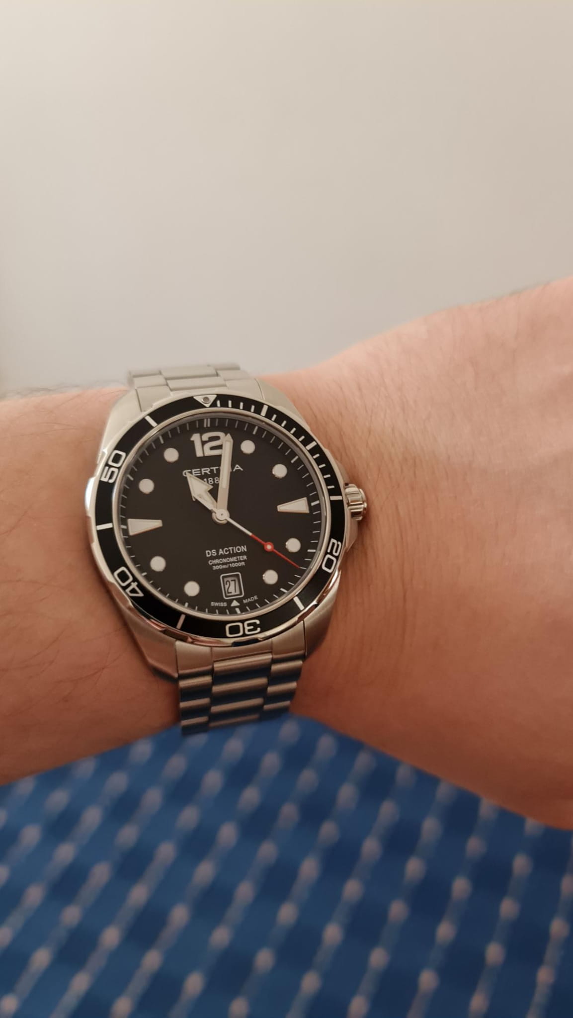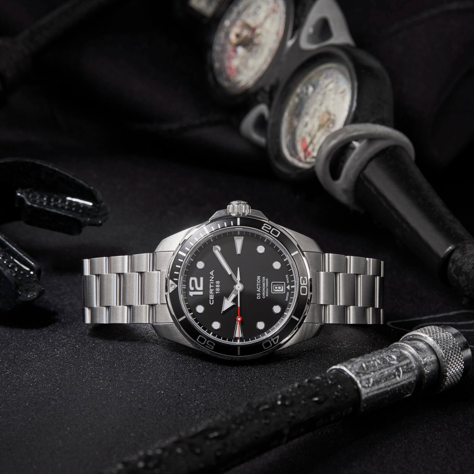 Это превосходная модель в серебристо-чёрной расцветке для тех, кто не готов соглашаться на меньшее. Наручные часы отличаются безупречными характеристиками по всем параметрам: ударопрочный корпусУдаропрочный корпусМеханизм заключён в корпус, выполненный из современных материалов, устойчивых к ударам, механическим повреждениям и падению с высоты: инновационный пластик, карбон, нержавеющая сталь, титан. из хирургической стали 316L, устойчивое к царапинам сапфировое стекло с антибликовой поверхностью, водостойкость до 30 бар, повышенная точность хода кварцевого швейцарского калибра ETA F07.412 Precidrive™Precidrive™Инновационный кварцевый механизм Certina. Часы, оснащённые этим швейцарским калибром, приравниваются к точности к сертифицированным хронометрам, точность хода составляет +/-10 секунд в год., подтверждённая сертификатом COSCСертификат COSCОфициальный сертификат, подтверждающий то, что часы ходят с особо высокой точностью. Для получения документа часы подвергаются тестовым испытаниям, разработанным швейцарским институтом тестирования хронометров COSC. Допустимая норма для механических часов -4/+6 секунд в день, для кварцевых моделей +/- 0,07 секунд в день.. Алюминиевый вращающийся безельБезельВнешний ободок, закрепляющий стекло. В спортивных часах так называется поворотное кольцо с делениями на циферблате, выполняет роль таймера – замеряет отрезки времени на шкале. Неподвижный безель – элемент декора. Однонаправленно вращающийся безель на дайверских часах позволяет фиксировать моменты погружения и выныривания на поверхность.. Закручивающиеся кнопки, заводная головка с системой защиты, задняя крышка. Индикатор EOLEOLПредставляет собой систему, уведомляющую владельца часов о необходимости замены элемента питания. За 2 недели до полного разряда батарейки секундная стрелка перестаёт ходить чётко и начинает перепрыгивать на 3-4 деления.. Апертура даты. Застёжка с фиксатором и удлинением для дайверовУдлинение для дайверовЗастёжка с удлинением для дайверов представляет собой безопасное крепление, которое позволяет надевать часы поверх гидрокостюма. Гибкая застёжка удлиняется на 1-2 миллиметра.. Диаметр корпуса: 43 мм.