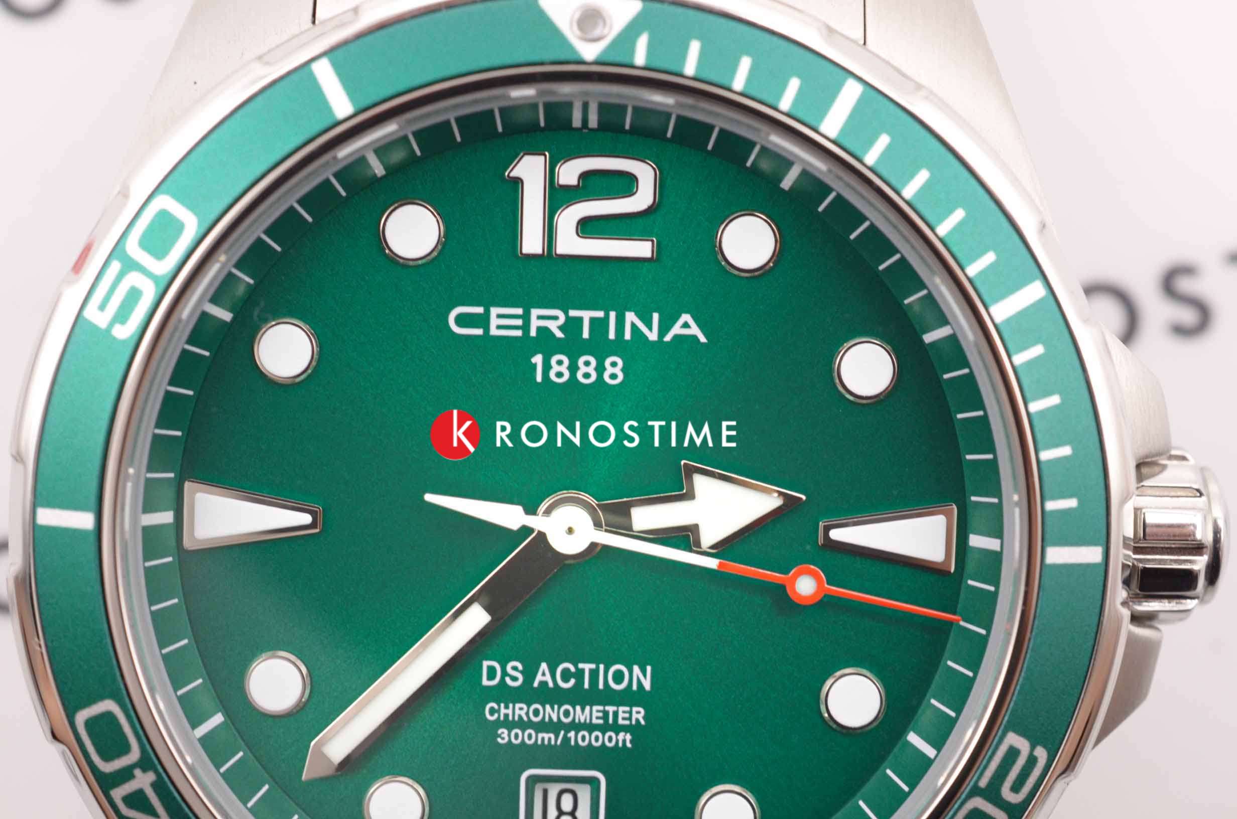 Это превосходная модель в серебристо-зелёной расцветке для тех, кто не готов соглашаться на меньшее. Наручные часы отличаются безупречными характеристиками по всем параметрам: ударопрочный корпусУдаропрочный корпусМеханизм заключён в корпус, выполненный из современных материалов, устойчивых к ударам, механическим повреждениям и падению с высоты: инновационный пластик, карбон, нержавеющая сталь, титан. из хирургической стали 316L, устойчивое к царапинам сапфировое стекло с антибликовой поверхностью, водостойкость до 30 бар, повышенная точность хода кварцевого швейцарского калибра ETA F07.412 Precidrive™Precidrive™Инновационный кварцевый механизм Certina. Часы, оснащённые этим швейцарским калибром, приравниваются к точности к сертифицированным хронометрам, точность хода составляет +/-10 секунд в год., подтверждённая сертификатом COSCСертификат COSCОфициальный сертификат, подтверждающий то, что часы ходят с особо высокой точностью. Для получения документа часы подвергаются тестовым испытаниям, разработанным швейцарским институтом тестирования хронометров COSC. Допустимая норма для механических часов -4/+6 секунд в день, для кварцевых моделей +/- 0,07 секунд в день.. Алюминиевый вращающийся безельБезельВнешний ободок, закрепляющий стекло. В спортивных часах так называется поворотное кольцо с делениями на циферблате, выполняет роль таймера – замеряет отрезки времени на шкале. Неподвижный безель – элемент декора. Однонаправленно вращающийся безель на дайверских часах позволяет фиксировать моменты погружения и выныривания на поверхность.. Закручивающиеся кнопки, заводная головка с системой защиты, задняя крышка. Индикатор EOLEOLПредставляет собой систему, уведомляющую владельца часов о необходимости замены элемента питания. За 2 недели до полного разряда батарейки секундная стрелка перестаёт ходить чётко и начинает перепрыгивать на 3-4 деления.. Апертура даты. Застёжка с фиксатором и удлинением для дайверовУдлинение для дайверовЗастёжка с удлинением для дайверов представляет собой безопасное крепление, которое позволяет надевать часы поверх гидрокостюма. Гибкая застёжка удлиняется на 1-2 миллиметра.. Диаметр корпуса: 43 мм.