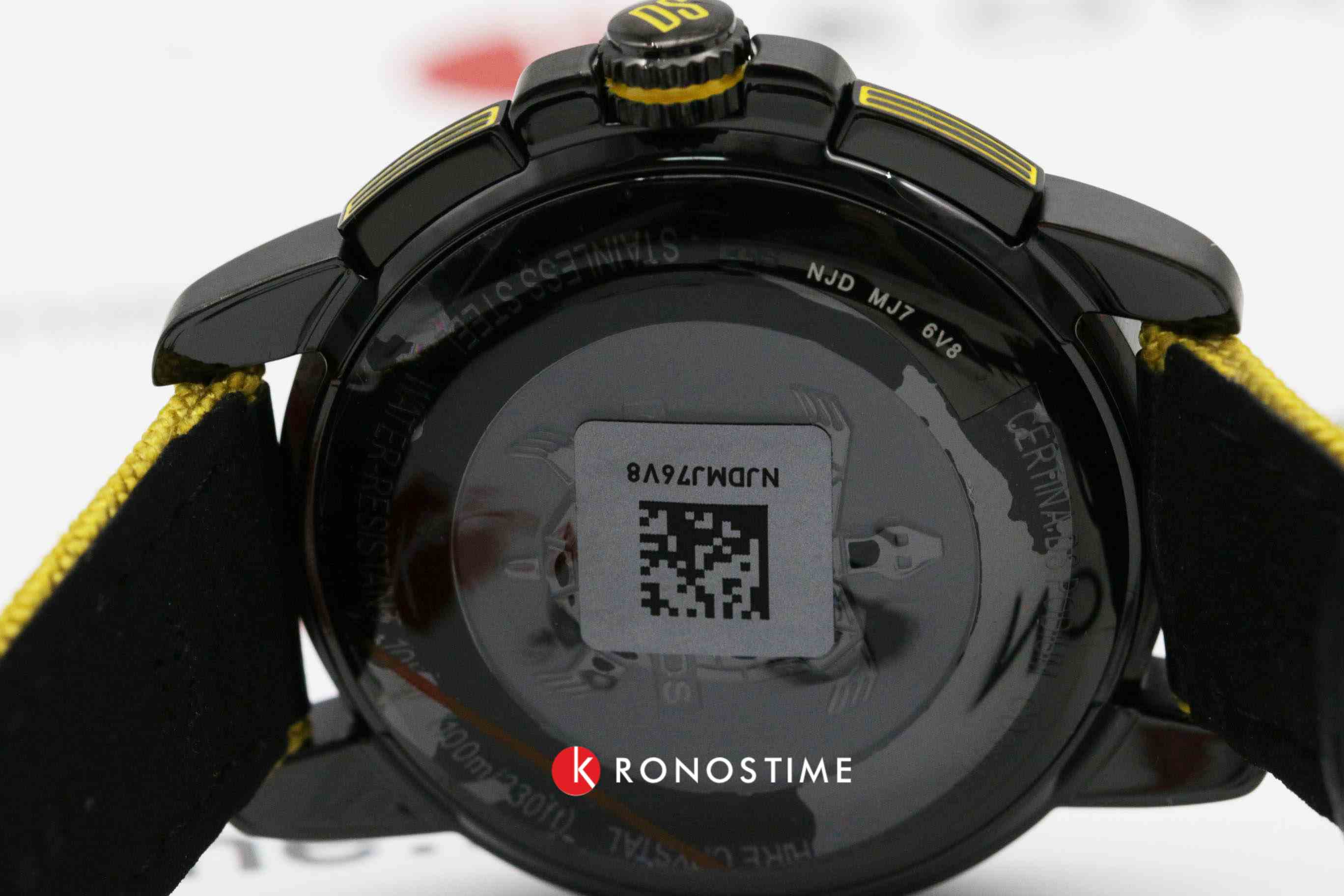 Наручные часы в спортивном стиле дополнены красными и жёлтыми деталями, что символизирует скоростное напряжение на гоночной трассе. Отличным дополнением стал кожаный ремешок. Кварцевый швейцарский механизм ETA G10.212 Precidrive™Precidrive™Инновационный кварцевый механизм Certina. Часы, оснащённые этим швейцарским калибром, приравниваются к точности к сертифицированным хронометрам, точность хода составляет +/-10 секунд в год. с повышенной точностью хода, подтверждённой сертификатом COSCСертификат COSCОфициальный сертификат, подтверждающий то, что часы ходят с особо высокой точностью. Для получения документа часы подвергаются тестовым испытаниям, разработанным швейцарским институтом тестирования хронометров COSC. Допустимая норма для механических часов -4/+6 секунд в день, для кварцевых моделей +/- 0,07 секунд в день.. Система DS ConceptDS ConceptDouble Security Concept, обозначает двойную надёжность и безупречную точность часов Certina. Двойная система защиты подразумевает обеспечение максимальной устойчивости к ударам и высоких показателей водонепроницаемости.. Двухстороннее антибликовое покрытие для стекла из сапфира. Корпус из нержавеющей стали с PVD-покрытиемPVDУльтратонкое покрытие наносится в технике вакуумного напыления, сочетает в себе нитрид титана особой прочности со слоем золота или оксида хрома. Несёт в себе декоративную или защитную функцию.. Стрелки и индексы с составом SuperLumiNovaЛюминесцентное покрытиеПозволяет считывать показания времени в темноте. Производители наносят на стрелки, часовые индексы, безель или поверхность циферблата светонакопительный состав, дающий холодное свечение.. Заводная головка с защитой. ХронографХронографФункция позволяет измерять отрезки времени с особой точностью: часы, минуты, секунды. Верным признаком хронографа является наличие на циферблате 3 дополнительных окошек-счётчиков., шкала тахиметраТахиметрРазмеченная шкала, располагается на ободке или безеле часов. Тахиметр позволяет рассчитать скорость на определённом участке пути, расстояние измеряется в километрах или милях., календарь, секундомер, индикатор EOLEOLПредставляет собой систему, уведомляющую владельца часов о необходимости замены элемента питания. За 2 недели до полного разряда батарейки секундная стрелка перестаёт ходить чётко и начинает перепрыгивать на 3-4 деления., Lap-функция измерения промежуточного времени (круга). Диаметр корпуса: 41 мм.