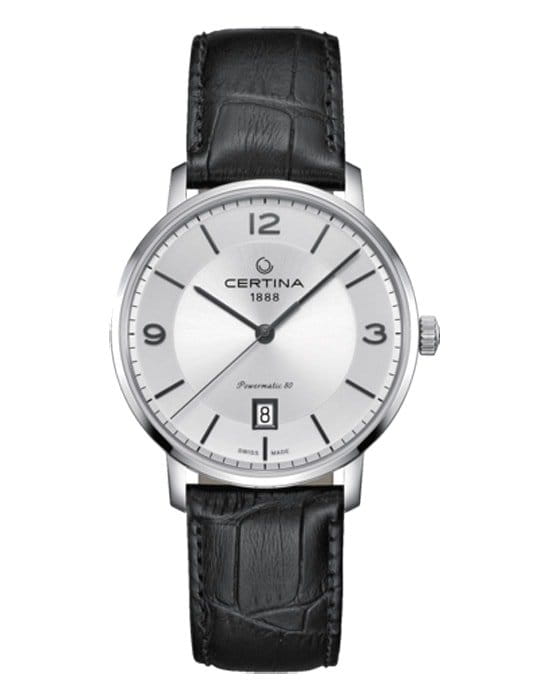 Модель выполнена в классическом стиле, благодаря чему она сохраняет актуальность во все времена. Цифру 6 заменяет прямоугольное окошко индикации текущего числа. Часы заводятся от движений руки носителя, швейцарский механизм ETA Powermatic 80Powermatic 80Эксклюзивный калибр от швейцарской компании ETA с увеличенным запасом хода до 80 часов за счёт удлинённой заводной пружины. Характеризуется улучшенной системой спуска со сниженным трением. сохраняет запас хода до 80-часов. Прозрачная задняя крышка. Сапфировое стекло. Стальной корпус с реализацией концепции DS ConceptDS ConceptDouble Security Concept, обозначает двойную надёжность и безупречную точность часов Certina. Двойная система защиты подразумевает обеспечение максимальной устойчивости к ударам и высоких показателей водонепроницаемости.. Чёрный ремешок из натуральной кожи. Водонепроницаемость 10 бар. Диаметр корпуса: 39 мм.