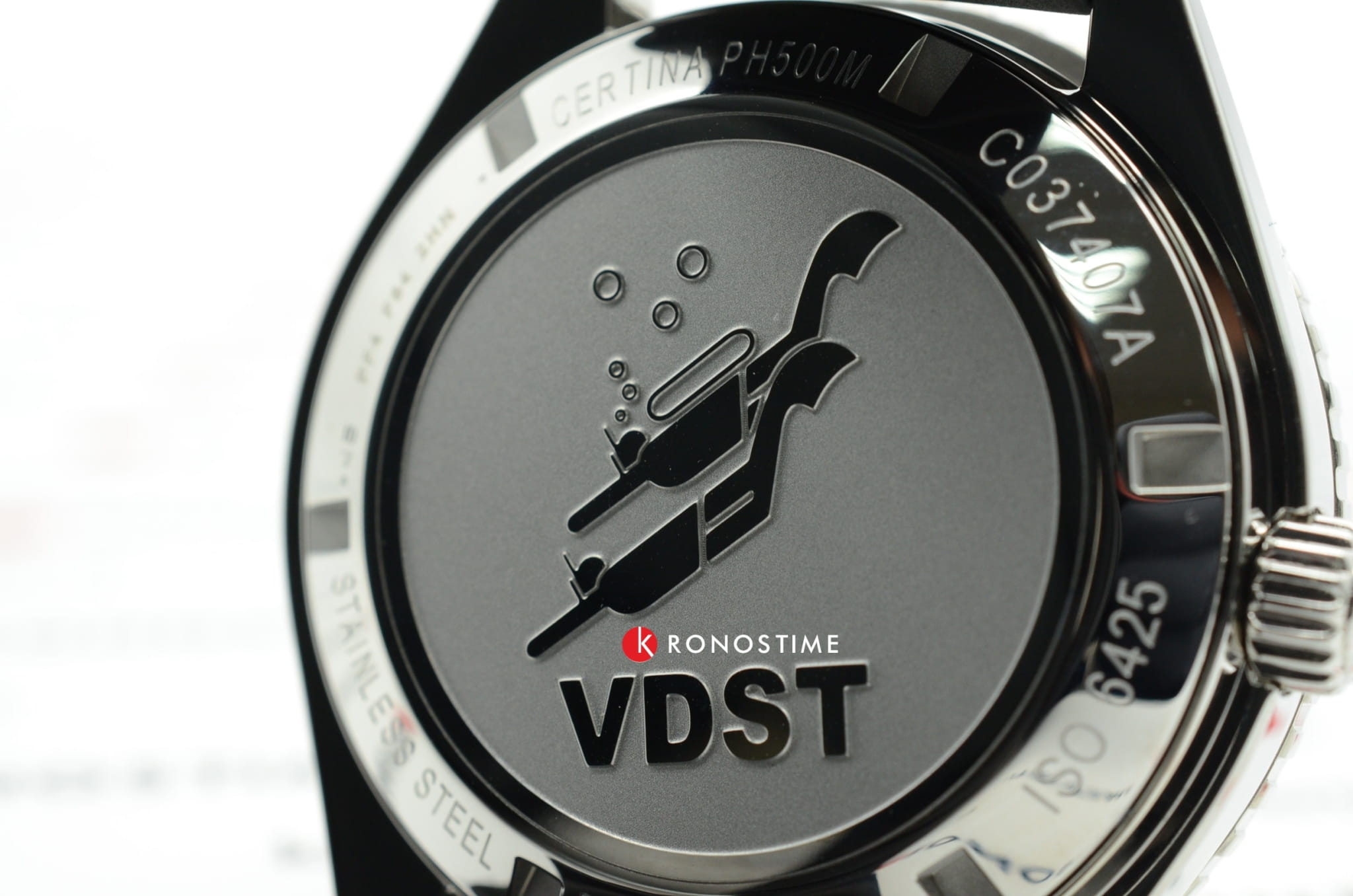 Оригинальный чёрный циферблат понравится ценителям ретро-дизайна. В комплекте с тканевым ремешком вы получаете дополнительный вариант из стали. Меняя их, вы можете экспериментировать с разными стилями. Уникальностью обладает не только аксессуар, но и упаковка, сделанная в виде бокса для дайвинга. Часы комплектуются автоматическим механизмом ETA Powermatic 80Powermatic 80Эксклюзивный калибр от швейцарской компании ETA с увеличенным запасом хода до 80 часов за счёт удлинённой заводной пружины. Характеризуется улучшенной системой спуска со сниженным трением. с 80-часовым запасом хода. Технология DS ConceptDS ConceptDouble Security Concept, обозначает двойную надёжность и безупречную точность часов Certina. Двойная система защиты подразумевает обеспечение максимальной устойчивости к ударам и высоких показателей водонепроницаемости.. Стекло с покрытием Nex scratchguard, устойчивым к царапинам. Вращающийся безельБезельВнешний ободок, закрепляющий стекло. В спортивных часах так называется поворотное кольцо с делениями на циферблате, выполняет роль таймера – замеряет отрезки времени на шкале. Неподвижный безель – элемент декора. Однонаправленно вращающийся безель на дайверских часах позволяет фиксировать моменты погружения и выныривания на поверхность.. Диаметр корпуса: 42,8 мм.