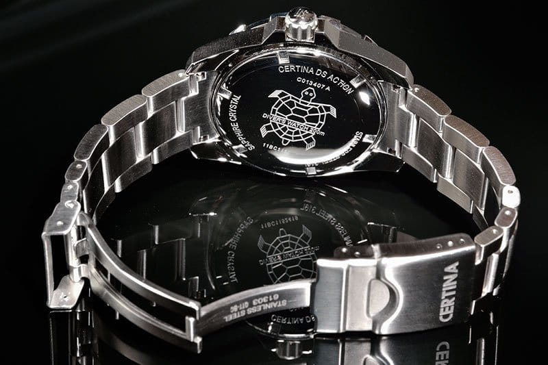 Часы Certina – это воплощение высочайшей точности и надежности часов, система DS расшифровывается Double Security; "двойная надежность". Беспрекословная точность и надежность, использование сложных технологий, инновационный подход в сочетании с традициями создания хронографов, которые марка пронесла через десятилетия, – все это позволяет компании предоставлять элитные, роскошные и стильные часы. На обратной стороне нанесено изображение черепахи в знак долговечности. Задняя крышка с повышенной прочностью, два кольца с уплотнением на заводной головке.
