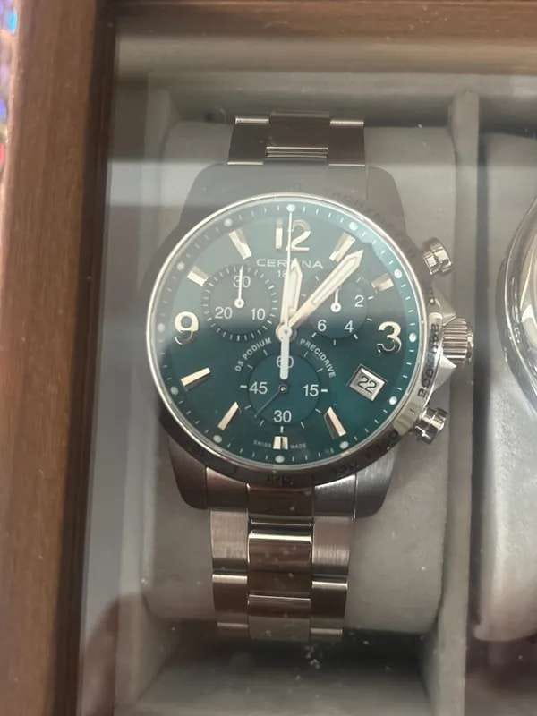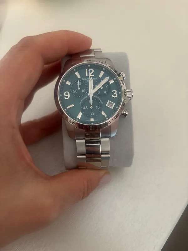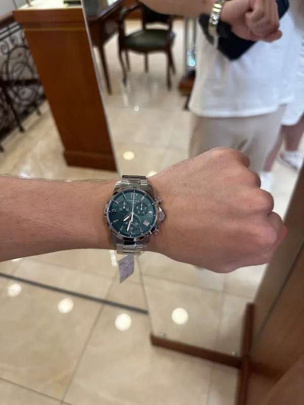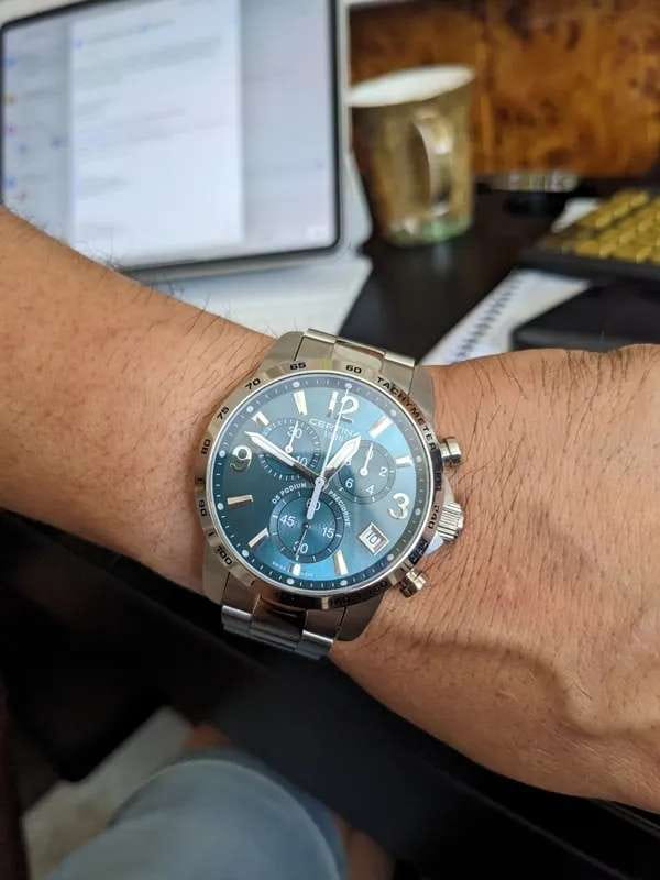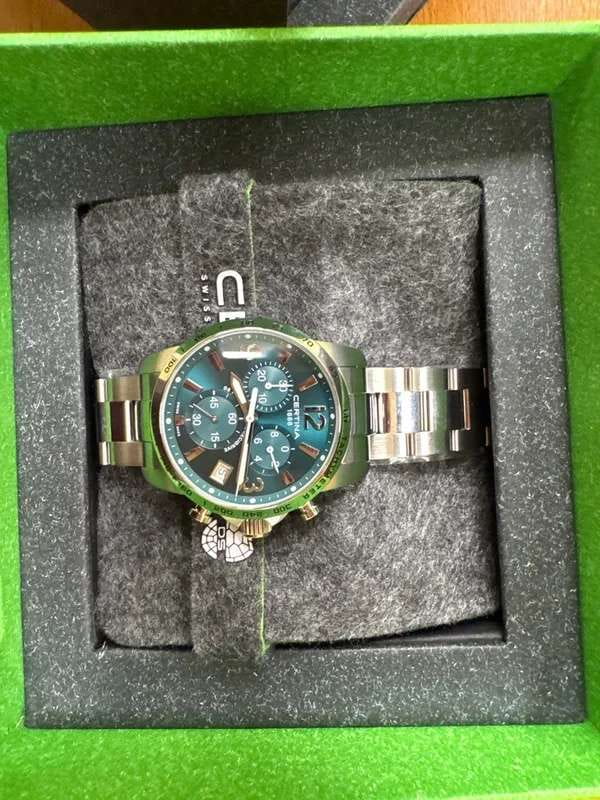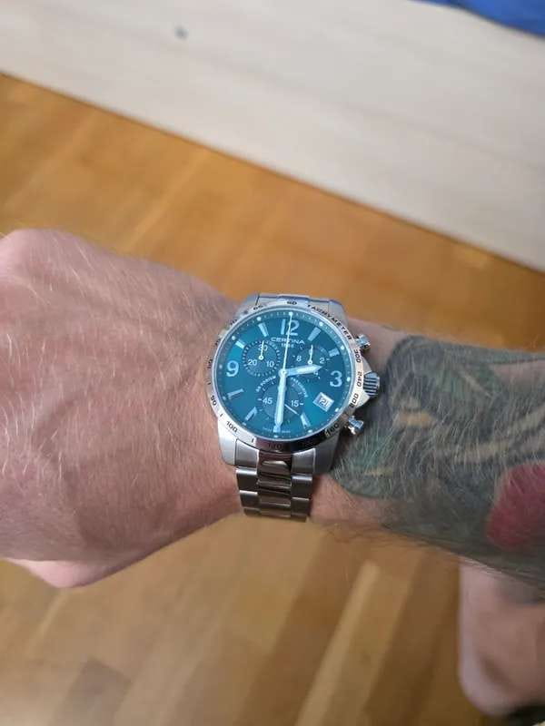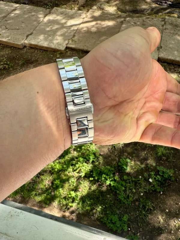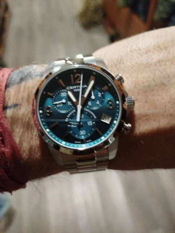 Certina DS не мои первые часы, но, безусловно, самые универсальные. Это идеальный вариант «одни на все случаи жизни»: они одинаково хорошо сочетаются и со светлой, и с темной одеждой, подходят как для шорт с майкой, так и для джинсов с рубашкой. Цвет циферблата отдельный восторг, модель очень стильная и привлекает комплименты. Единственный нюанс: секундная стрелка хронографа стоит с небольшим отклонением от метки «12», что, впрочем, типично для бюджетного швейцарского сегмента.
