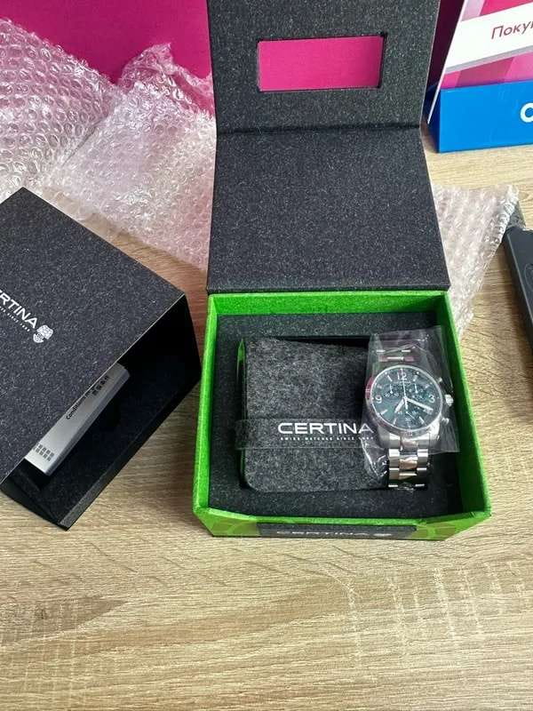 Модель гармонично соединяет в себе лаконичную элегантность и спортивную составляющую. Зелёный циферблат имеет крупные элементы, обеспечивающими оптимальную читаемость показаний времени. Часы устойчивы к высоким нагрузкам благодаря концепции DS ConceptDS ConceptDouble Security Concept, обозначает двойную надёжность и безупречную точность часов Certina. Двойная система защиты подразумевает обеспечение максимальной устойчивости к ударам и высоких показателей водонепроницаемости., дополнительной неуязвимости способствуют сапфировое стекло, заводная головка с защитным уплотнением и нержавеющая сталь в качестве основного материала. Швейцарский кварцевый механизм ETA G10.212 AA Precidrive™Precidrive™Инновационный кварцевый механизм Certina. Часы, оснащённые этим швейцарским калибром, приравниваются к точности к сертифицированным хронометрам, точность хода составляет +/-10 секунд в год.. Водостойкость 100 метров. Задняя крышка с гравировкой. БезельБезельВнешний ободок, закрепляющий стекло. В спортивных часах так называется поворотное кольцо с делениями на циферблате, выполняет роль таймера – замеряет отрезки времени на шкале. Неподвижный безель – элемент декора. Однонаправленно вращающийся безель на дайверских часах позволяет фиксировать моменты погружения и выныривания на поверхность., размеченный тахиметрической шкалойТахиметрРазмеченная шкала, располагается на ободке или безеле часов. Тахиметр позволяет рассчитать скорость на определённом участке пути, расстояние измеряется в километрах или милях.. Люминесцентная подсветкаЛюминесцентное покрытиеПозволяет считывать показания времени в темноте. Производители наносят на стрелки, часовые индексы, безель или поверхность циферблата светонакопительный состав, дающий холодное свечение. стрелок. . Измерение десятых долей секунд в режиме реального времени, хронографХронографФункция позволяет измерять отрезки времени с особой точностью: часы, минуты, секунды. Верным признаком хронографа является наличие на циферблате 3 дополнительных окошек-счётчиков., отображение числа, индикатор , EOLEOLПредставляет собой систему, уведомляющую владельца часов о необходимости замены элемента питания. За 2 недели до полного разряда батарейки секундная стрелка перестаёт ходить чётко и начинает перепрыгивать на 3-4 деления.. Диаметр корпуса: 41 мм.
