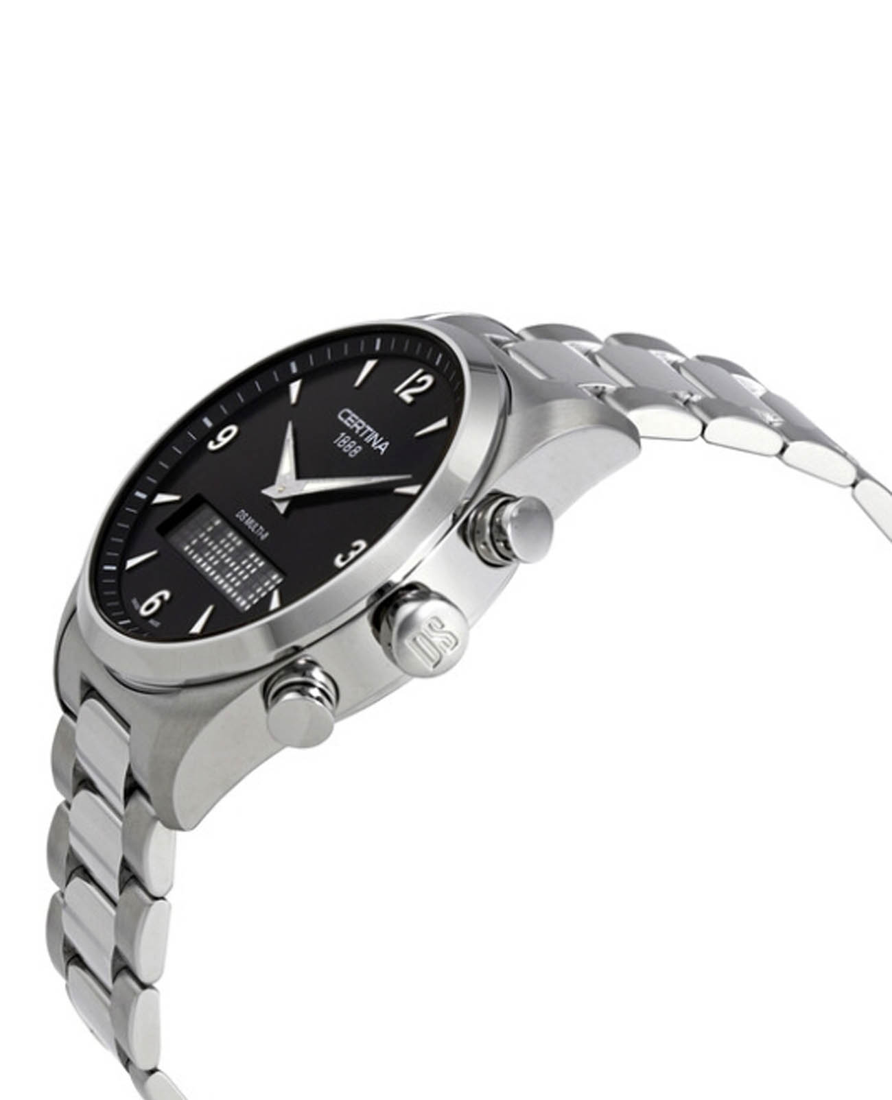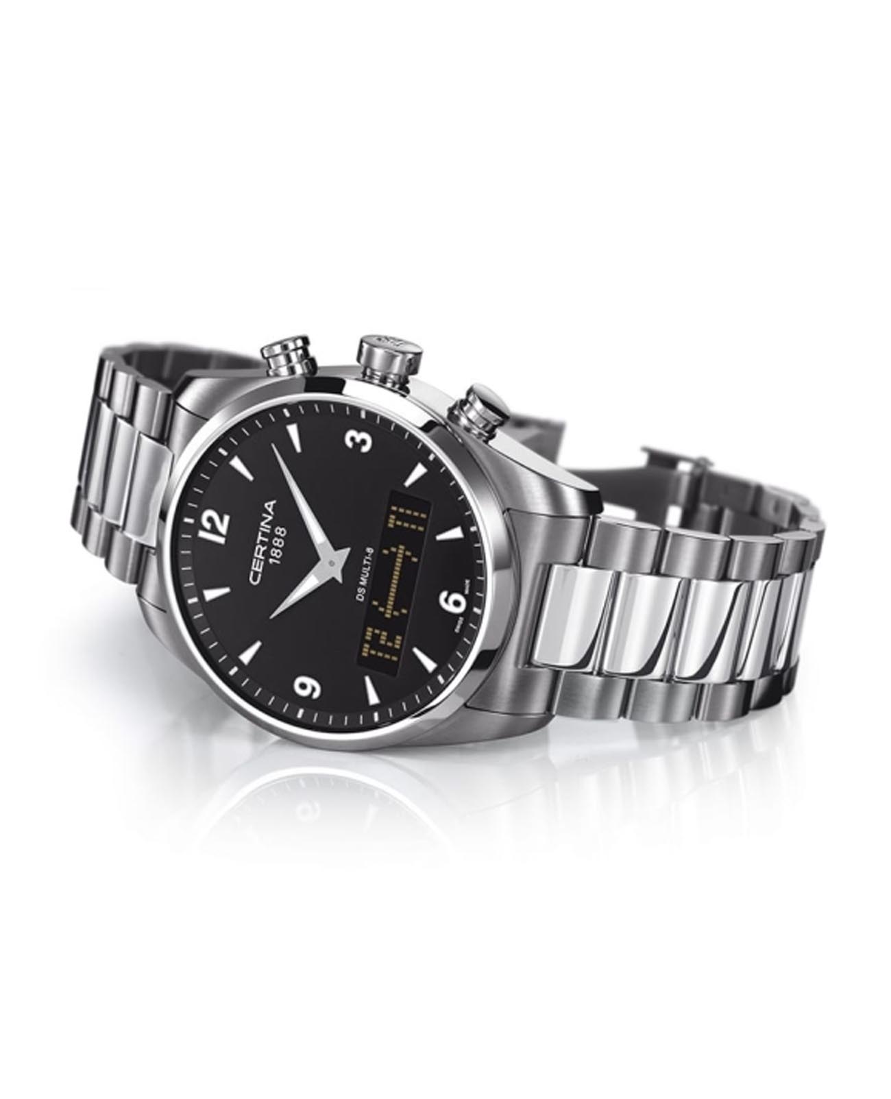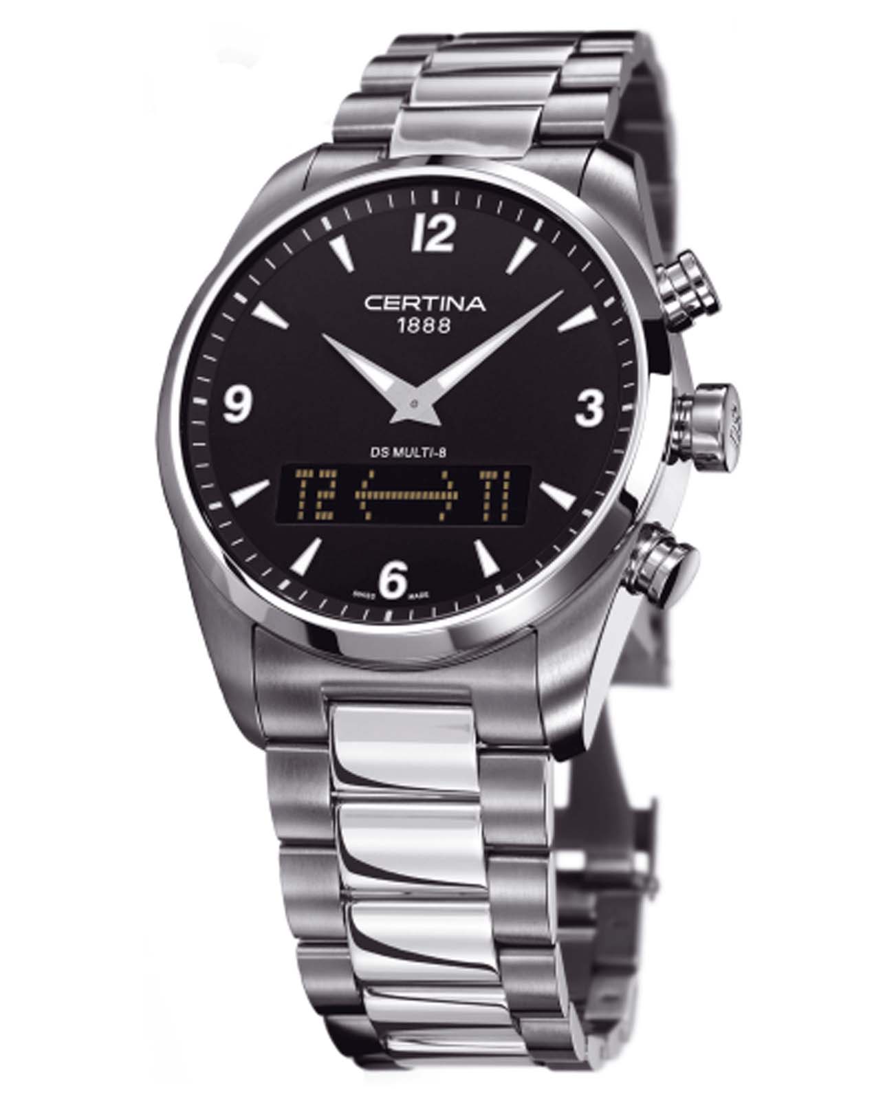 Мужские швейцарские кварцевые водонепроницаемые часы- хронографХронографФункция позволяет измерять отрезки времени с особой точностью: часы, минуты, секунды. Верным признаком хронографа является наличие на циферблате 3 дополнительных окошек-счётчиков. с будильникомБудильникБуди́льник — часы, в заданный момент времени подающие звуковой, световой и/или в редких случаях другой сигнал. Certina DS Multi-8 C0204191105700, кварцевый механизм с высокой точностью. Сапфировое стеклоСапфировое стеклоПрочный и надёжный материал из кристалла сапфира синтетического происхождения, характеризующийся особой твёрдостью и устойчивостью к царапинам и повреждениям. устойчивое к появлению царапин, обладающее высокой прозрачностью. Корпус часов изготовлен из стали. Стильный инверсионный матричный дисплей расширяет функционал часов. Второй часовой поясВторой часовой поясФункция, позволяющая отображать время двух часовых поясов одновременно. отображается на цифровом дисплее. Заостренные прямоугольные стрелки в стиле Baton с люминесцентным покрытиемЛюминесцентное покрытиеПозволяет считывать показания времени в темноте. Производители наносят на стрелки, часовые индексы, безель или поверхность циферблата светонакопительный состав, дающий холодное свечение., которое светится в темноте после непродолжительной зарядки на свету. Метки в виде штрихов и арабских цифр. Задняя крышка крепится на винтах. Класс водозащиты: 100 метров, позволит плавать, нырять и заниматься другими водными видами спорта. Стальной браслет на раскладной застёжкеРаскладная застёжкаТакой тип застёжки используется только на браслетах из металла. Она никогда не раскрывается полностью, происходит разделение на 2 и более частей. Раскладывающая застёжка снизит вероятность потери часов к минимуму..