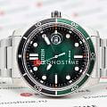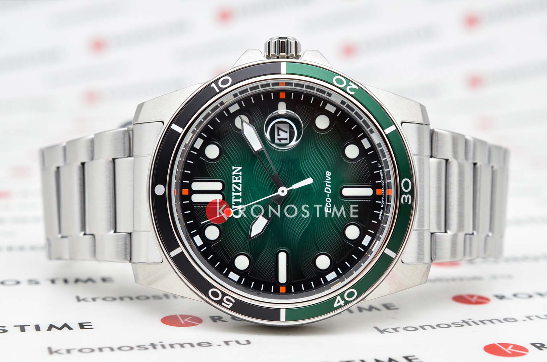 Citizen AW1811-82X — это стильные и практичные часы японского производства, которые станут отличным повседневным аксессуаром для активных мужчин. Модель оснащена современным кварцевым механизмом Citizen J810 и инновационной системой Eco-Drive, работающей на солнечной энергии, благодаря чему часы не требуют замены батарейки, а запас хода достигает 240 дней. Корпус диаметром 41,5 мм и толщиной 11,8 мм выполнен из прочной нержавеющей стали, а на безельБезельВнешний ободок, закрепляющий стекло. В спортивных часах так называется поворотное кольцо с делениями на циферблате, выполняет роль таймера – замеряет отрезки времени на шкале. Неподвижный безель – элемент декора. Однонаправленно вращающийся безель на дайверских часах позволяет фиксировать моменты погружения и выныривания на поверхность. нанесено черное и зеленое IP-покрытиеIP-покрытиеМетод ионного напыления. Демонстрирует повышенную устойчивость к истиранию, окислению и химическим веществам. Под воздействием высокого давления и температуры около 1500°C молекулы металла надёжно соединяются с частицами корпуса часов., что обеспечивает надежность и долговечность. Зеленый циферблат украшен метками в виде точек и штрихов, а стрелки и метки с люминесцентным покрытиемЛюминесцентное покрытиеПозволяет считывать показания времени в темноте. Производители наносят на стрелки, часовые индексы, безель или поверхность циферблата светонакопительный состав, дающий холодное свечение. гарантируют отличную видимость времени даже в темноте. Окошко даты с увеличительным стеклом расположено в положении 3 часа, а заводная головка с защитой и завинчивающаяся задняя крышка повышают уровень безопасности и герметичности. Часы оснащены функцией индикации заряда EOLEOLПредставляет собой систему, уведомляющую владельца часов о необходимости замены элемента питания. За 2 недели до полного разряда батарейки секундная стрелка перестаёт ходить чётко и начинает перепрыгивать на 3-4 деления. и системой предотвращения перезарядки для дополнительного удобства. Минеральное стеклоМинеральное стеклоМинеральное стекло представляет собой искусственно выращенный минерал кварца. Такое стекло отличается особой устойчивостью к повреждениям и царапинам. Уступает по некоторым качествам сапфировому стеклу. эффективно защищает циферблат от царапин. Водозащита 100WR позволяет носить часы во время плавания и занятий водными видами спорта. Стальной браслет с раскладной застёжкойРаскладная застёжкаТакой тип застёжки используется только на браслетах из металла. Она никогда не раскрывается полностью, происходит разделение на 2 и более частей. Раскладывающая застёжка снизит вероятность потери часов к минимуму. обеспечивает комфорт и надежную фиксацию на руке, а вес модели составляет 138 грамм, что делает часы удобными для ежедневного ношения.
