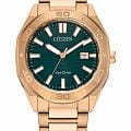 Часы Citizen BM7633-81X сочетают в себе современный стиль и высокую функциональность. Японский кварцевый механизм калибра Citizen E111 обеспечивает точную работу и надежность, а инновационная система Eco-Drive позволяет забыть о замене батареек — питание осуществляется за счет солнечной энергии, с запасом хода до 180 дней. Корпус и браслет выполнены из прочной нержавеющей стали с золотистым IP-покрытиемIP-покрытиеМетод ионного напыления. Демонстрирует повышенную устойчивость к истиранию, окислению и химическим веществам. Под воздействием высокого давления и температуры около 1500°C молекулы металла надёжно соединяются с частицами корпуса часов., что гарантирует долговечность и устойчивость к износу. На безелеБезельВнешний ободок, закрепляющий стекло. В спортивных часах так называется поворотное кольцо с делениями на циферблате, выполняет роль таймера – замеряет отрезки времени на шкале. Неподвижный безель – элемент декора. Однонаправленно вращающийся безель на дайверских часах позволяет фиксировать моменты погружения и выныривания на поверхность. выгравирована секундная и минутная шкала. Элегантный темно-зеленый циферблат со стрелками и метками с люминесцентным покрытиемЛюминесцентное покрытиеПозволяет считывать показания времени в темноте. Производители наносят на стрелки, часовые индексы, безель или поверхность циферблата светонакопительный состав, дающий холодное свечение. защищен устойчивым к царапинам минеральным стекломМинеральное стеклоМинеральное стекло представляет собой искусственно выращенный минерал кварца. Такое стекло отличается особой устойчивостью к повреждениям и царапинам. Уступает по некоторым качествам сапфировому стеклу. . Водозащита до 100 метров позволяет использовать часы при плавании и в повседневных ситуациях. Окно даты расположено на отметке «3 часа», а браслет оснащен удобной раскладной застёжкойРаскладная застёжкаТакой тип застёжки используется только на браслетах из металла. Она никогда не раскрывается полностью, происходит разделение на 2 и более частей. Раскладывающая застёжка снизит вероятность потери часов к минимуму.. Диаметр корпуса составляет 41 мм, толщина — 9,7 мм, ширина браслета — 22 мм, вес — 136 г. Эти часы станут отличным выбором для тех, кто ценит надежность, практичность и стильный внешний вид.