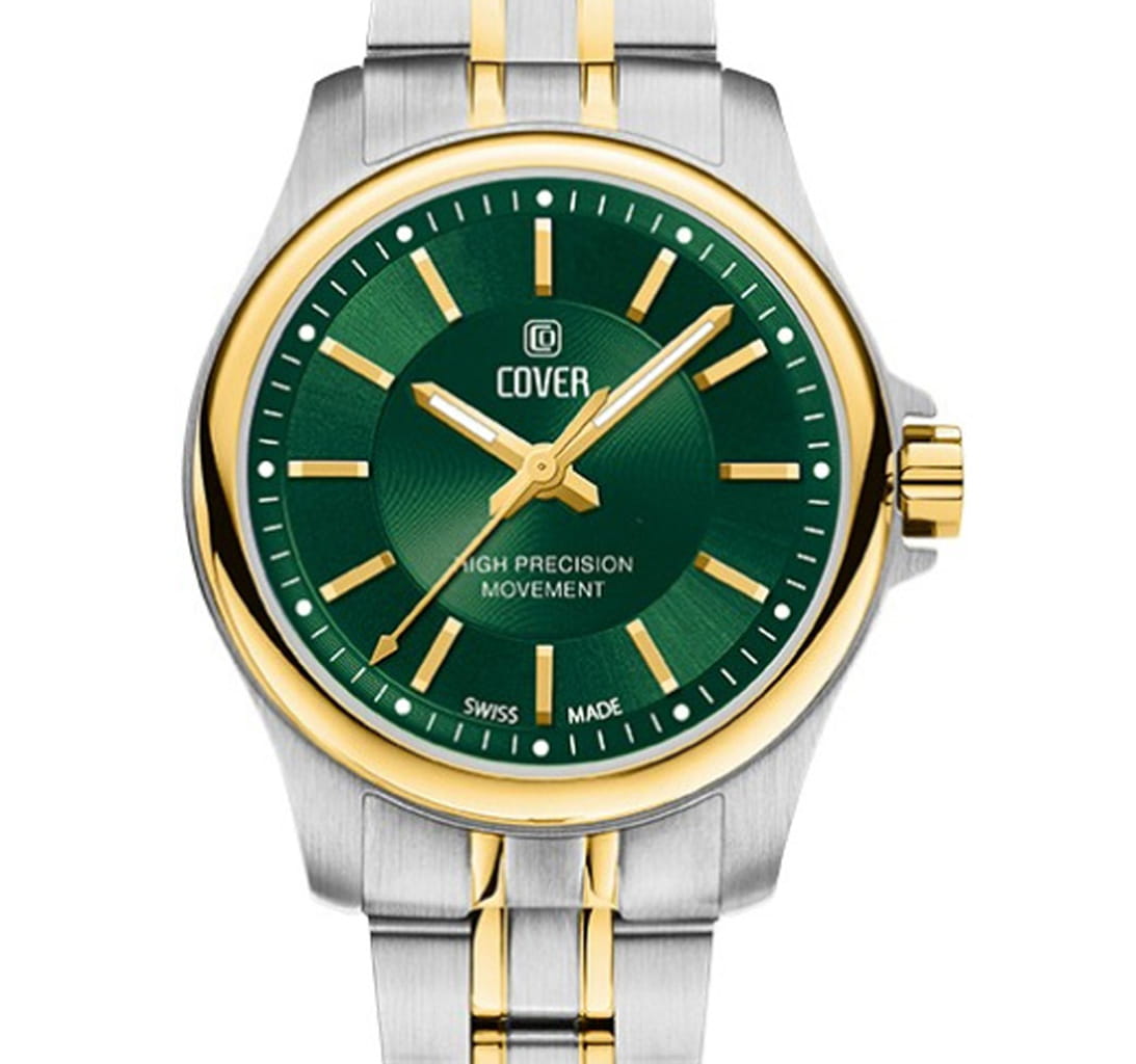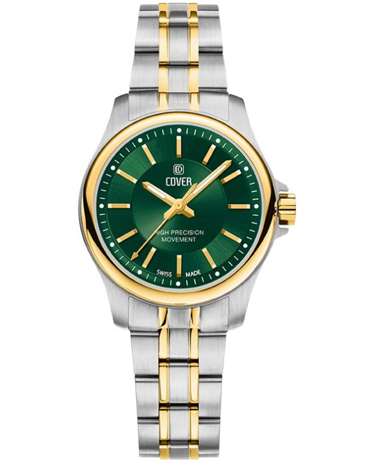 Женские наручные часы Cover CO201.32 из коллекции Marville сочетают в себе классический дизайн и высокую точность швейцарского производства. Модель обладает круглым корпусом диаметром 28 мм, изготовленным из нержавеющей стали, что придает изделию благородный внешний вид. Зеленый циферблат оснащен стрелками с люминесцентным покрытиемЛюминесцентное покрытиеПозволяет считывать показания времени в темноте. Производители наносят на стрелки, часовые индексы, безель или поверхность циферблата светонакопительный состав, дающий холодное свечение..  Для защиты используется сапфировое стеклоСапфировое стеклоПрочный и надёжный материал из кристалла сапфира синтетического происхождения, характеризующийся особой твёрдостью и устойчивостью к царапинам и повреждениям. с антибликовым покрытиемАнтибликовое покрытиеСлой оксида металла в 0,13-0,3 микрон, благодаря которому стекло часов не бликует и не отражает свет. Антибликовое покрытие уменьшает отражение света в 10 раз, обеспечивая отличную читаемость показателей циферблата., обеспечивающее прочную защиту от царапин и превосходную читаемость времени даже при ярком свете. БезельБезельВнешний ободок, закрепляющий стекло. В спортивных часах так называется поворотное кольцо с делениями на циферблате, выполняет роль таймера – замеряет отрезки времени на шкале. Неподвижный безель – элемент декора. Однонаправленно вращающийся безель на дайверских часах позволяет фиксировать моменты погружения и выныривания на поверхность. с золотистым PVD-покрытиемPVDУльтратонкое покрытие наносится в технике вакуумного напыления, сочетает в себе нитрид титана особой прочности со слоем золота или оксида хрома. Несёт в себе декоративную или защитную функцию.. Часы работают на высокоточном кварцевом механизме ETA, гарантирующем исключительную точность хода с погрешностью около 20 секунд в месяц. Браслет выполнен из нержавеющей стали с частичным PVD-покрытиемPVDУльтратонкое покрытие наносится в технике вакуумного напыления, сочетает в себе нитрид титана особой прочности со слоем золота или оксида хрома. Несёт в себе декоративную или защитную функцию. и оснащен раскладной застежкойРаскладная застёжкаТакой тип застёжки используется только на браслетах из металла. Она никогда не раскрывается полностью, происходит разделение на 2 и более частей. Раскладывающая застёжка снизит вероятность потери часов к минимуму., обеспечивающей комфортное ношение и безопасность. Водонепроницаемость достигает 10 атмосфер (100 метров), что позволяет использовать их во время плавания и других водных видов спорта, однако не рекомендуется для глубоководного дайвинга. Эти швейцарские часы станут идеальным дополнением как классического, так и современного образа.