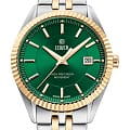 Циферблат зеленого цвета с текстурированным узором и контрастными штрихами, защищен минеральным стекломМинеральное стеклоМинеральное стекло представляет собой искусственно выращенный минерал кварца. Такое стекло отличается особой устойчивостью к повреждениям и царапинам. Уступает по некоторым качествам сапфировому стеклу. с сапфировым напылением. Браслет из нержавеющей стали с частичным PVD-покрытиемPVDУльтратонкое покрытие наносится в технике вакуумного напыления, сочетает в себе нитрид титана особой прочности со слоем золота или оксида хрома. Несёт в себе декоративную или защитную функцию. цвета золота.