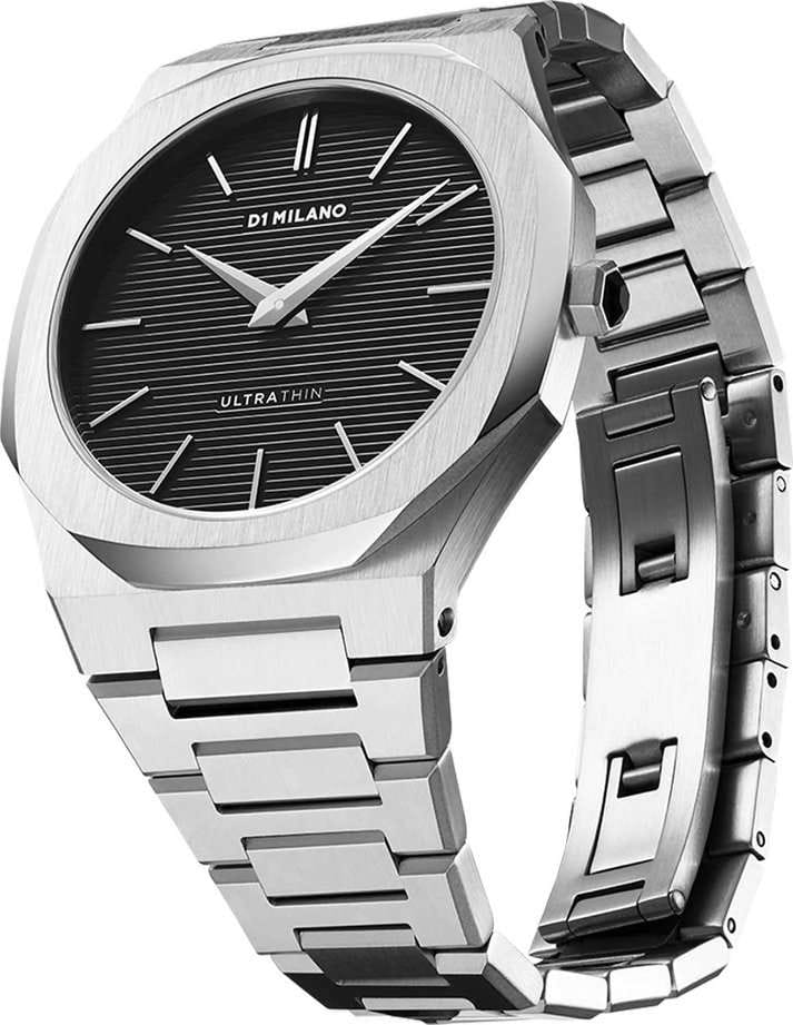 Часы D1 Milano UTBJ14 — это уникальные кварцевые часы, которые подчеркнут ваш изысканный стиль. Эти наручные часы из коллекции Ultra Thin с эффектным монохромным дизайном станут выразительным акцентом вашего образа. Корпус диаметром 40 мм из нержавеющей стали придает часам современный и утонченный вид. Черный циферблат метками в виде штрихов, а серебристые хроматические стрелки и индексы создают стильный контраст, подчёркивая элегантность модели. Задняя крышка из нержавеющей стали закреплена на 8-х винтах и дополнена индивидуальным серийным номером, что подчеркивает уникальность каждого экземпляра. Стальной браслет с раскладной застёжкойРаскладная застёжкаТакой тип застёжки используется только на браслетах из металла. Она никогда не раскрывается полностью, происходит разделение на 2 и более частей. Раскладывающая застёжка снизит вероятность потери часов к минимуму. обеспечивает надежность и комфорт в повседневном использовании. Сапфировое стеклоСапфировое стеклоПрочный и надёжный материал из кристалла сапфира синтетического происхождения, характеризующийся особой твёрдостью и устойчивостью к царапинам и повреждениям. с антибликовым покрытием защищает циферблат, а водозащита до 50WR делает эти часы практичным выбором для любых условий. Благодаря калибру Miyota 1L22, они отличаются точностью и надежностью. Эти итальянские часы представляют собой идеальное сочетание традиционного мастерства и инновационного подхода, воплощая в себе новый взгляд на классическую элегантность.