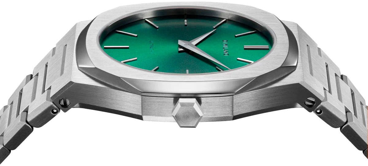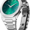 Часы D1 Milano UTBJ37 — это уникальные кварцевые часы, которые подчеркнут ваш изысканный стиль. Эти наручные часы из коллекции Ultra Thin с эффектным монохромным дизайном станут выразительным акцентом вашего образа. Корпус диаметром 40 мм из нержавеющей стали придает часам современный и утонченный вид. Зеленый циферблат метками в виде штрихов, а серебристые хроматические стрелки и индексы создают стильный контраст, подчёркивая элегантность модели. Задняя крышка из нержавеющей стали закреплена на 8-х винтах и дополнена индивидуальным серийным номером, что подчеркивает уникальность каждого экземпляра. Стальной браслет с раскладной застёжкойРаскладная застёжкаТакой тип застёжки используется только на браслетах из металла. Она никогда не раскрывается полностью, происходит разделение на 2 и более частей. Раскладывающая застёжка снизит вероятность потери часов к минимуму. обеспечивает надежность и комфорт в повседневном использовании. Сапфировое стеклоСапфировое стеклоПрочный и надёжный материал из кристалла сапфира синтетического происхождения, характеризующийся особой твёрдостью и устойчивостью к царапинам и повреждениям. с антибликовым покрытием защищает циферблат, а водозащита до 50WR делает эти часы практичным выбором для любых условий. Благодаря калибру Miyota 1L22, они отличаются точностью и надежностью. Эти итальянские часы представляют собой идеальное сочетание традиционного мастерства и инновационного подхода, воплощая в себе новый взгляд на классическую элегантность.
