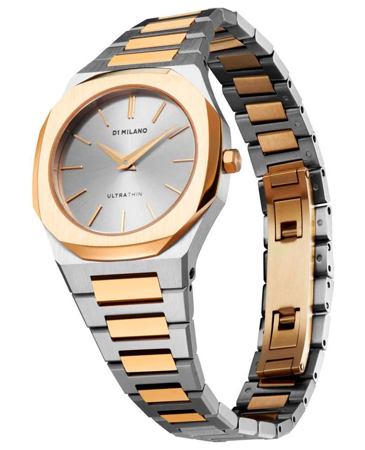 Женские наручные часы D1 Milano UTBL34 из коллекции Ultra Thin сочетают в себе элегантный дизайн и современные технологии. Модель обладает круглым корпусом диаметром 30 мм, изготовленным из нержавеющей стали, что обеспечивает высокую устойчивость к внешним воздействиям. БезельБезельВнешний ободок, закрепляющий стекло. В спортивных часах так называется поворотное кольцо с делениями на циферблате, выполняет роль таймера – замеряет отрезки времени на шкале. Неподвижный безель – элемент декора. Однонаправленно вращающийся безель на дайверских часах позволяет фиксировать моменты погружения и выныривания на поверхность. с PVD-покрытиемPVDУльтратонкое покрытие наносится в технике вакуумного напыления, сочетает в себе нитрид титана особой прочности со слоем золота или оксида хрома. Несёт в себе декоративную или защитную функцию. золотого цвета. Для защиты циферблата используется сапфировое стеклоСапфировое стеклоПрочный и надёжный материал из кристалла сапфира синтетического происхождения, характеризующийся особой твёрдостью и устойчивостью к царапинам и повреждениям., которое эффективно противостоит царапинам и механическим повреждениям. Часы оснащены кварцевым механизмом Miyota 1L22, гарантирующим точное время без необходимости подзаводки. Водонепроницаемость модели достигает 5 атмосфер (50 метров), что позволяет использовать их при контакте с водой, например, во время мытья рук или дождя. Браслет выполнен из нержавеющей стали с частичным PVD-покрытиемPVDУльтратонкое покрытие наносится в технике вакуумного напыления, сочетает в себе нитрид титана особой прочности со слоем золота или оксида хрома. Несёт в себе декоративную или защитную функцию. на раскладной застёжкеРаскладная застёжкаТакой тип застёжки используется только на браслетах из металла. Она никогда не раскрывается полностью, происходит разделение на 2 и более частей. Раскладывающая застёжка снизит вероятность потери часов к минимуму., обеспечивающей комфортное ношение и безопасность. Циферблат серебристого цвета с узором Light Sunray придает часам особую изысканность и делает их идеальным выбором для повседневного использования или особых случаев.
