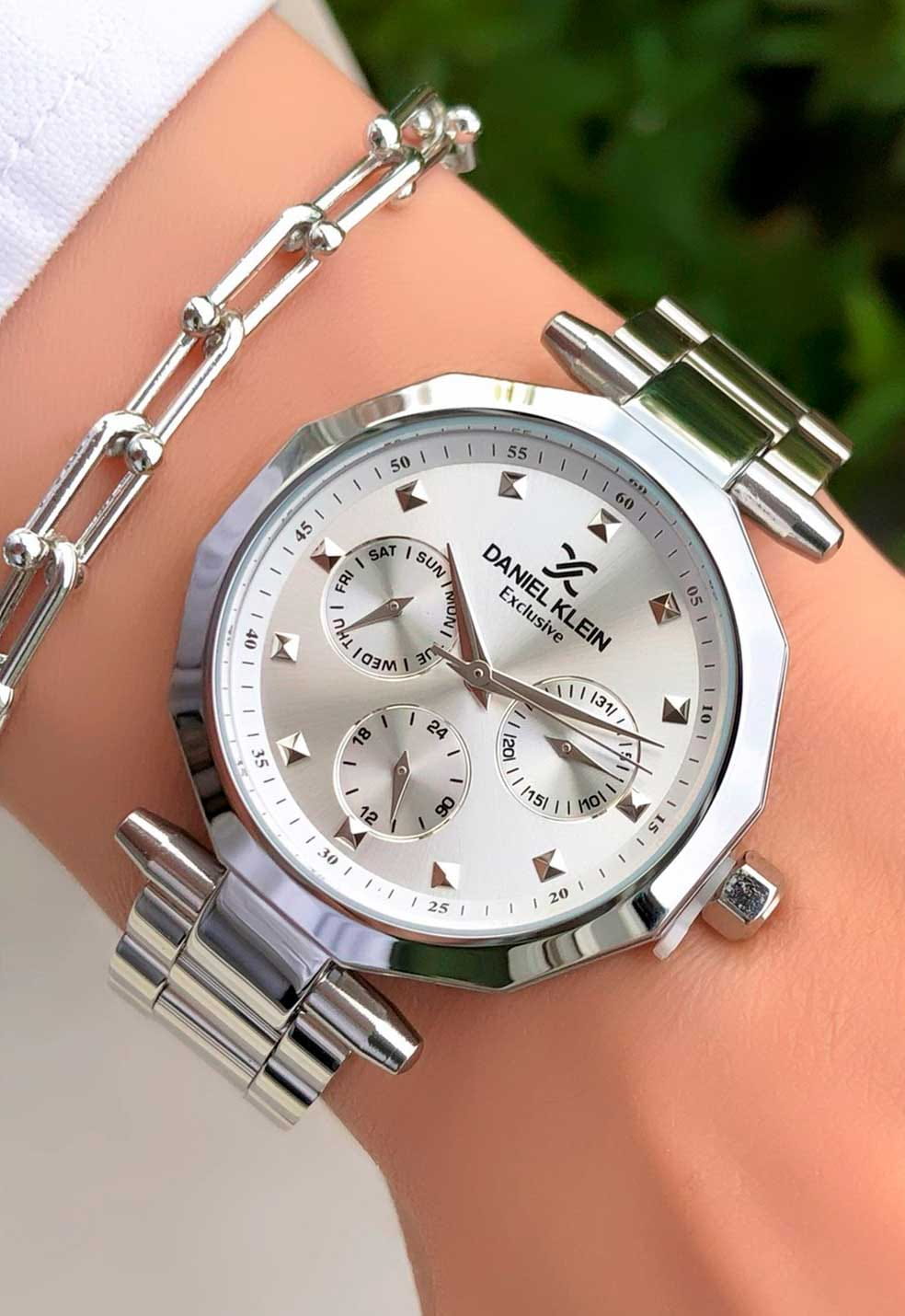 Женские кварцевые часы Daniel Klein — это стильный и функциональный аксессуар. Корпус диаметром 35 мм выполнен из металла. Циферблат серебристого цвета выполнен по технологии Sunray («солнечные лучи») и оформлен точками, клиновидными стрелками в стиле Dauphine и фирменным логотипом Daniel Klein в положении 12 часов. Присутствуют отдельные индикаторы дня недели и даты, а также 24-часовой формат времени. Циферблат защищён минеральным стекломМинеральное стеклоМинеральное стекло представляет собой искусственно выращенный минерал кварца. Такое стекло отличается особой устойчивостью к повреждениям и царапинам. Уступает по некоторым качествам сапфировому стеклу.. Механизм — японское кварцевое движение калибра TMI S.Epson VX3JE1. Гранёная заводная головка придаёт изделию дополнительный стиль. Часы оснащены стальным браслетом на раскладной застёжкеРаскладная застёжкаТакой тип застёжки используется только на браслетах из металла. Она никогда не раскрывается полностью, происходит разделение на 2 и более частей. Раскладывающая застёжка снизит вероятность потери часов к минимуму.. Водонепроницаемость 30 м позволяет использовать часы в повседневных условиях. Идеальный выбор для тех, кто ценит турецкое качество и универсальный дизайн.