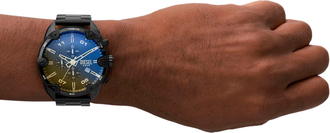 Мужские наручные часы-хронографХронографФункция позволяет измерять отрезки времени с особой точностью: часы, минуты, секунды. Верным признаком хронографа является наличие на циферблате 3 дополнительных окошек-счётчиков. с секундомеромСекундомерСекундоме́р — прибор, способный измерять интервалы времени с точностью до долей секунды. Diesel Spiked DZ4609, кварцевый механизм с высокой точностью. Класс водозащиты: 50 метров, позволит защитить корпус от случайных брызг или капель дождя. Корпус часов изготовлен из стали с IP-покрытиемIP-покрытиеМетод ионного напыления. Демонстрирует повышенную устойчивость к истиранию, окислению и химическим веществам. Под воздействием высокого давления и температуры около 1500°C молекулы металла надёжно соединяются с частицами корпуса часов.. Стальной браслет на раскладной застёжкеРаскладная застёжкаТакой тип застёжки используется только на браслетах из металла. Она никогда не раскрывается полностью, происходит разделение на 2 и более частей. Раскладывающая застёжка снизит вероятность потери часов к минимуму. с IP-покрытиемIP-покрытиеМетод ионного напыления. Демонстрирует повышенную устойчивость к истиранию, окислению и химическим веществам. Под воздействием высокого давления и температуры около 1500°C молекулы металла надёжно соединяются с частицами корпуса часов.. Окошко даты находится в положении 4 часа. Метки в виде штрихов и арабских цифр.