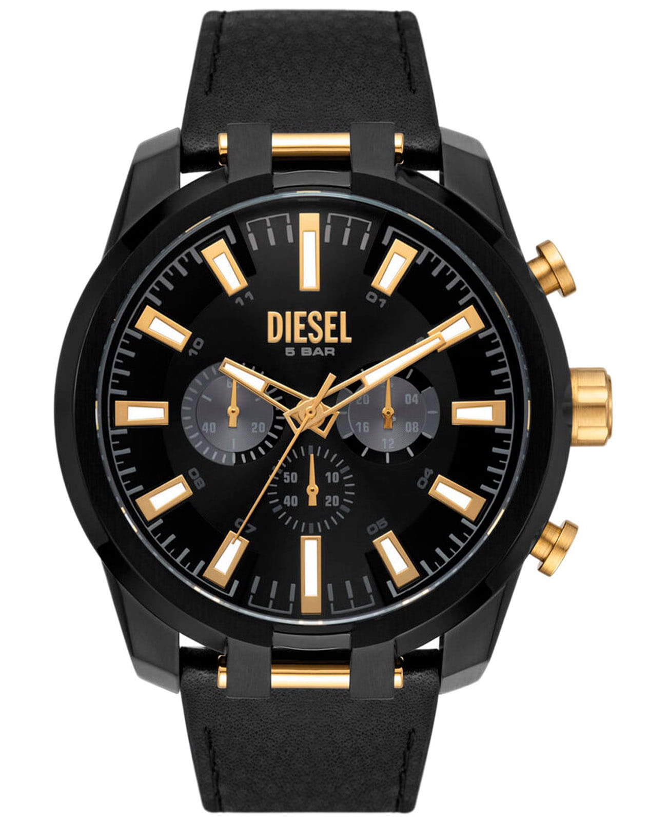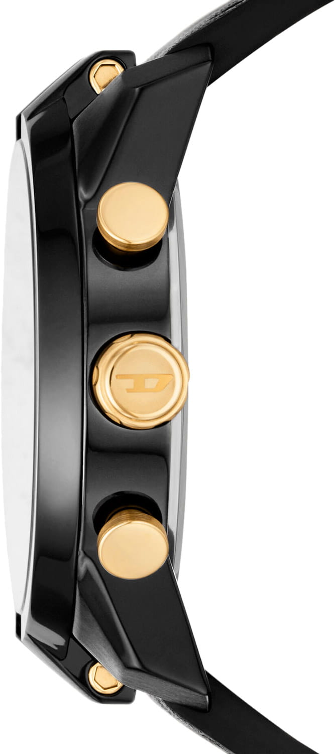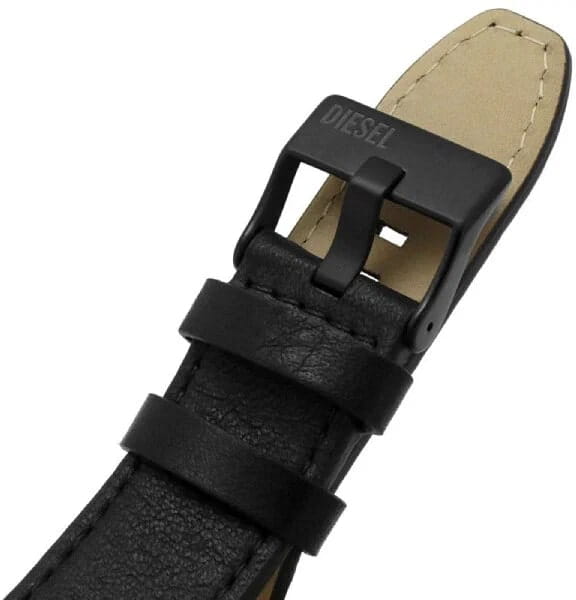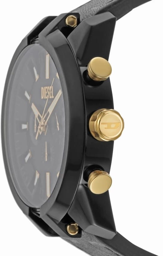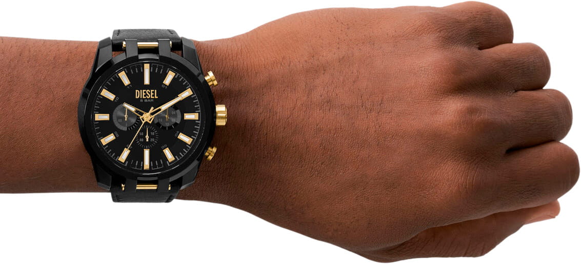 Мужские наручные часы-хронографХронографФункция позволяет измерять отрезки времени с особой точностью: часы, минуты, секунды. Верным признаком хронографа является наличие на циферблате 3 дополнительных окошек-счётчиков. с секундомеромСекундомерСекундоме́р — прибор, способный измерять интервалы времени с точностью до долей секунды. Diesel Split DZ4610, кварцевый механизм с высокой точностью. Класс водозащиты: 50 метров, позволит защитить корпус от случайных брызг или капель дождя. Корпус часов изготовлен из стали с IP-покрытиемIP-покрытиеМетод ионного напыления. Демонстрирует повышенную устойчивость к истиранию, окислению и химическим веществам. Под воздействием высокого давления и температуры около 1500°C молекулы металла надёжно соединяются с частицами корпуса часов.. Кожаный ремешок на стандартной застёжке. 12-ти и 24-х часовой формат времени. Циферблат выполнен по технологии Sunray (солнечные лучи). Метки в виде штрихов. Стрелки и метки с люминесцентным покрытиемЛюминесцентное покрытиеПозволяет считывать показания времени в темноте. Производители наносят на стрелки, часовые индексы, безель или поверхность циферблата светонакопительный состав, дающий холодное свечение..