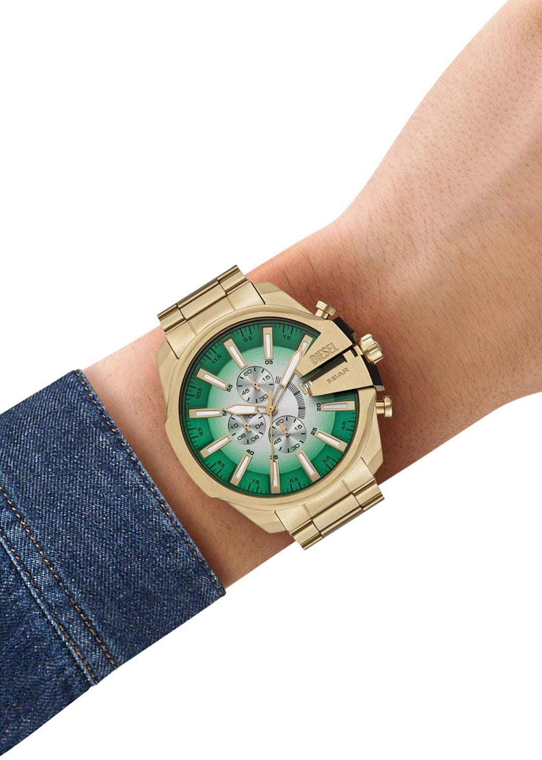 Часы Diesel Mega Chief Slim DZ4684 — это современная модель для стильных мужчин, сочетающая функциональность и высококачественные материалы. Часы оснащены кварцевым механизмом, который обеспечивает высокую точность хода. Корпус диаметром 48 мм выполнен из нержавеющей стали с PVD-покрытиемPVDУльтратонкое покрытие наносится в технике вакуумного напыления, сочетает в себе нитрид титана особой прочности со слоем золота или оксида хрома. Несёт в себе декоративную или защитную функцию., а минеральное стеклоМинеральное стеклоМинеральное стекло представляет собой искусственно выращенный минерал кварца. Такое стекло отличается особой устойчивостью к повреждениям и царапинам. Уступает по некоторым качествам сапфировому стеклу. защищает циферблат от царапин. Зеленый циферблат оснащён стрелками и метками  с люминесцентным покрытиемЛюминесцентное покрытиеПозволяет считывать показания времени в темноте. Производители наносят на стрелки, часовые индексы, безель или поверхность циферблата светонакопительный состав, дающий холодное свечение., обеспечивающими удобство чтения даже в условиях низкой освещённости. Окошко даты расположено на отметке 3 часа. Функция хронографаХронографФункция позволяет измерять отрезки времени с особой точностью: часы, минуты, секунды. Верным признаком хронографа является наличие на циферблате 3 дополнительных окошек-счётчиков. позволяет измерять промежутки времени с высокой точностью. Часы оснащены стальным браслетом с PVD-покрытиемPVDУльтратонкое покрытие наносится в технике вакуумного напыления, сочетает в себе нитрид титана особой прочности со слоем золота или оксида хрома. Несёт в себе декоративную или защитную функцию. с раскладной застёжкойРаскладная застёжкаТакой тип застёжки используется только на браслетах из металла. Она никогда не раскрывается полностью, происходит разделение на 2 и более частей. Раскладывающая застёжка снизит вероятность потери часов к минимуму., обеспечивая комфортное ношение и добавляя стильный акцент.  Водозащита 50 метров защищает часы от брызг и дождя, делая их подходящими для повседневного использования. Diesel — это идеальное сочетание современного дизайна, надёжности и практичности.