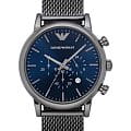 Мужские часы Emporio Armani Luigi AR1979 - стильные с кварцевым механизмом сочетают в себе элегантность и функциональность, что делает их идеальным аксессуаром для современного мужчины. Корпус часов из нержавеющей стали с черным IP-покрытиемIP-покрытиеМетод ионного напыления. Демонстрирует повышенную устойчивость к истиранию, окислению и химическим веществам. Под воздействием высокого давления и температуры около 1500°C молекулы металла надёжно соединяются с частицами корпуса часов., что обеспечивает долговечность и устойчивость к внешним воздействиям. Минеральное стеклоМинеральное стеклоМинеральное стекло представляет собой искусственно выращенный минерал кварца. Такое стекло отличается особой устойчивостью к повреждениям и царапинам. Уступает по некоторым качествам сапфировому стеклу. защищает синий циферблат, добавляя изысканности всей конструкции. Размер корпуса составляет 46 мм, что придаёт часам солидный внешний вид. Часы имеют водонепроницаемость WR50 (5 атм), это позволяет использовать их в повседневной жизни, не опасаясь воздействия воды. Стальной браслет черного цвета из миланского плетения с классической застежкой, благодаря IP-покрытиюIP-покрытиеМетод ионного напыления. Демонстрирует повышенную устойчивость к истиранию, окислению и химическим веществам. Под воздействием высокого давления и температуры около 1500°C молекулы металла надёжно соединяются с частицами корпуса часов., обеспечивает комфортное и надёжное крепление на запястье.  Этот хронографХронографФункция позволяет измерять отрезки времени с особой точностью: часы, минуты, секунды. Верным признаком хронографа является наличие на циферблате 3 дополнительных окошек-счётчиков. с функцией секундомераСекундомерСекундоме́р — прибор, способный измерять интервалы времени с точностью до долей секунды. и календарем, отображающим дату, станет идеальным аксессуаром для тех, кто ценит функциональность и итальянское качество. Стрелки с люминесцентным покрытиемЛюминесцентное покрытиеПозволяет считывать показания времени в темноте. Производители наносят на стрелки, часовые индексы, безель или поверхность циферблата светонакопительный состав, дающий холодное свечение. обеспечивают удобное считывание времени в темноте после кратковременного пребывания на свету, что делает эти часы практичными в любых условиях.