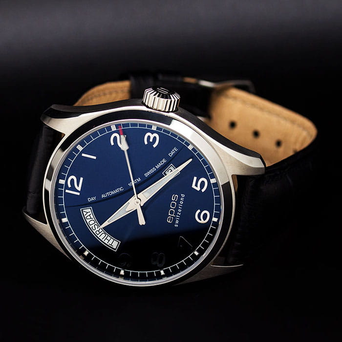 Мужские механические часы с автоподзаводом Epos из коллекции Passion — это сочетание швейцарского мастерства и современного дизайна. Корпус диаметром 43 мм выполнен из нержавеющей стали 316L. Циферблат синего цвета оформлен сатинированным узором «Солнечные лучи» и дополнен окошками даты и дня недели. Циферблат защищён сапфировым стекломСапфировое стеклоПрочный и надёжный материал из кристалла сапфира синтетического происхождения, характеризующийся особой твёрдостью и устойчивостью к царапинам и повреждениям.. Стрелки с люминесцентным покрытиемЛюминесцентное покрытиеПозволяет считывать показания времени в темноте. Производители наносят на стрелки, часовые индексы, безель или поверхность циферблата светонакопительный состав, дающий холодное свечение., обеспечивающим хорошую читаемость в темноте. Механизм — швейцарский калибр ETA 2834 с запасом хода 38 часов. Прозрачная задняя крышка позволяет наблюдать за работой механизма. Часы оснащены кожаным ремешком чёрного цвета со стандартной застёжкой. Водонепроницаемость 100 м позволяет использовать часы для плавания. Гарантия — 24 месяца. Универсальный выбор для ценителя классики и точного механизма.