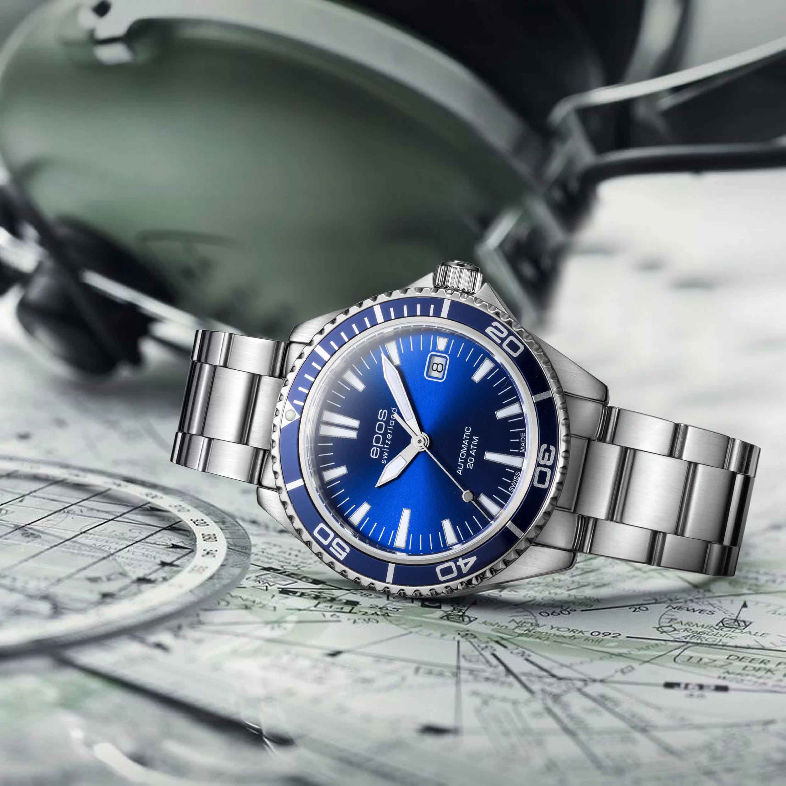 Мужские механические часы с автоподзаводом Epos из коллекции Diver — это надёжный инструмент для активного образа жизни. Корпус диаметром 41 мм и толщиной 12 мм выполнен из нержавеющей стали 316L. Циферблат синего цвета оформлен с матовой поверхностью, с печатными индексами и стрелками с покрытием цвета родия. Циферблат защищён сапфировым стекломСапфировое стеклоПрочный и надёжный материал из кристалла сапфира синтетического происхождения, характеризующийся особой твёрдостью и устойчивостью к царапинам и повреждениям.. Стрелки и метки с люминесцентным покрытиемЛюминесцентное покрытиеПозволяет считывать показания времени в темноте. Производители наносят на стрелки, часовые индексы, безель или поверхность циферблата светонакопительный состав, дающий холодное свечение. Super-Luminova, обеспечивающим отличную читаемость в темноте. Механизм — швейцарский калибр ETA 2824. Окошко даты расположено в положении 3 часов. БезельБезельВнешний ободок, закрепляющий стекло. В спортивных часах так называется поворотное кольцо с делениями на циферблате, выполняет роль таймера – замеряет отрезки времени на шкале. Неподвижный безель – элемент декора. Однонаправленно вращающийся безель на дайверских часах позволяет фиксировать моменты погружения и выныривания на поверхность. — однонаправленный вращающийся, с PVD-покрытиемPVDУльтратонкое покрытие наносится в технике вакуумного напыления, сочетает в себе нитрид титана особой прочности со слоем золота или оксида хрома. Несёт в себе декоративную или защитную функцию.. и шкалой погружений, что делает часы пригодными для дайвинга. Завинчивающаяся коронка и задняя крышка обеспечивают повышенную защиту. Часы оснащены стальным браслетом с литыми звеньями в 3 ряда и раскладной застёжкойРаскладная застёжкаТакой тип застёжки используется только на браслетах из металла. Она никогда не раскрывается полностью, происходит разделение на 2 и более частей. Раскладывающая застёжка снизит вероятность потери часов к минимуму. с дополнительным фиксатором. Водонепроницаемость 200 м позволяет использовать часы для глубоководных погружений. Гарантия — 24 месяца. Идеальный выбор для тех, кто ценит точность, прочность и функциональность.