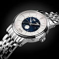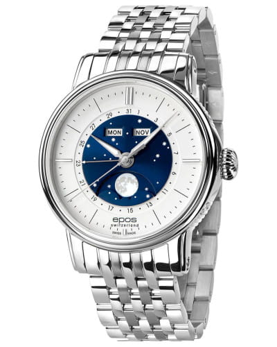 Мужские швейцарские механические часы с автоподзаводом Epos Oeuvre d'art 3439.322.20.18.30. Сапфировое стеклоСапфировое стеклоПрочный и надёжный материал из кристалла сапфира синтетического происхождения, характеризующийся особой твёрдостью и устойчивостью к царапинам и повреждениям. устойчивое к появлению царапин, обладающее высокой прозрачностью. Корпус и браслет часов изготовлен из нержавеющей стали. Стрелки и метки с люминесцентной подсветкойЛюминесцентное покрытиеПозволяет считывать показания времени в темноте. Производители наносят на стрелки, часовые индексы, безель или поверхность циферблата светонакопительный состав, дающий холодное свечение.. В механизме 25 камней, частота 28800 полуколебаний в час. Запас хода 42 часа. Механизм декорирован узором Cotes de Geneve. Циферблат выполнен по технологии Sunray (солнечные лучи). В центре циферблат дополнен изображением ночного неба со светящимися звездами и большой светящейся луной. Накладные метки в виде штрихов. Дата отображается центральной стрелкой. Окошко дня недели и месяца. Автоматический указатель фазы луны. Винтажная заводная головка. Прозрачная задняя крышка. Класс водозащиты: 50 метров, позволит защитить корпус от случайных брызг или капель дождя. Стальной браслет на раскладной застёжкеРаскладная застёжкаТакой тип застёжки используется только на браслетах из металла. Она никогда не раскрывается полностью, происходит разделение на 2 и более частей. Раскладывающая застёжка снизит вероятность потери часов к минимуму..