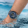 Мужские механические часы с автоподзаводом Epos из коллекции Diver — это профессиональный дайверский инструмент с швейцарским качеством. Корпус диаметром 43 мм и толщиной 14 мм выполнен из нержавеющей стали 316L с PVD-покрытиемPVDУльтратонкое покрытие наносится в технике вакуумного напыления, сочетает в себе нитрид титана особой прочности со слоем золота или оксида хрома. Несёт в себе декоративную или защитную функцию.. Циферблат синего цвета с пескоструйной обработкой оформлен аппликациями часовых индексов и крупными цифрами с покрытием. Циферблат защищён сапфировым стекломСапфировое стеклоПрочный и надёжный материал из кристалла сапфира синтетического происхождения, характеризующийся особой твёрдостью и устойчивостью к царапинам и повреждениям.. Стрелки и метки с люминесцентным покрытиемЛюминесцентное покрытиеПозволяет считывать показания времени в темноте. Производители наносят на стрелки, часовые индексы, безель или поверхность циферблата светонакопительный состав, дающий холодное свечение. Super-Luminova, обеспечивающим отличную читаемость в темноте. Механизм — швейцарский калибр ETA 2824. Окошко даты расположено в положении 3 часов. БезельБезельВнешний ободок, закрепляющий стекло. В спортивных часах так называется поворотное кольцо с делениями на циферблате, выполняет роль таймера – замеряет отрезки времени на шкале. Неподвижный безель – элемент декора. Однонаправленно вращающийся безель на дайверских часах позволяет фиксировать моменты погружения и выныривания на поверхность. — однонаправленный вращающийся, с синей керамической накладкой и рельефной шкалой погружений. Завинчивающаяся коронка и задняя крышка обеспечивают повышенную защиту. Часы оснащены стальным браслетом с литыми звеньями в 3 ряда и раскладной застёжкойРаскладная застёжкаТакой тип застёжки используется только на браслетах из металла. Она никогда не раскрывается полностью, происходит разделение на 2 и более частей. Раскладывающая застёжка снизит вероятность потери часов к минимуму. с двойной блокировкой и дополнительным фиксатором. Автоматический гелиевый клапан позволяет использовать часы при профессиональном дайвинге. Водонепроницаемость 500 м соответствует требованиям для глубоководных погружений. Гарантия — 24 месяца. Идеальный выбор для тех, кто ценит надёжность, точность и экстремальные испытания.