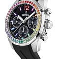 Яркий стиль и функциональность этих часов придутся по душе активной девушке. Часы-хронографХронографФункция позволяет измерять отрезки времени с особой точностью: часы, минуты, секунды. Верным признаком хронографа является наличие на циферблате 3 дополнительных окошек-счётчиков.. Кварцевый механизм с высокой точностью. Минеральное стеклоМинеральное стеклоМинеральное стекло представляет собой искусственно выращенный минерал кварца. Такое стекло отличается особой устойчивостью к повреждениям и царапинам. Уступает по некоторым качествам сапфировому стеклу. устойчивое к появлению царапин, обладающее высокой прозрачностью. Черный циферблат. Стрелки и метки с люминесцентным покрытиемЛюминесцентное покрытиеПозволяет считывать показания времени в темноте. Производители наносят на стрелки, часовые индексы, безель или поверхность циферблата светонакопительный состав, дающий холодное свечение.. БезельБезельВнешний ободок, закрепляющий стекло. В спортивных часах так называется поворотное кольцо с делениями на циферблате, выполняет роль таймера – замеряет отрезки времени на шкале. Неподвижный безель – элемент декора. Однонаправленно вращающийся безель на дайверских часах позволяет фиксировать моменты погружения и выныривания на поверхность. украшен цветными кристаллами. Класс водозащиты: 100 метров, позволит плавать, нырять и заниматься другими водными видами спорта. Корпус часов изготовлен из нержавеющей стали. Каучуковый ремешок с классической застежкой.