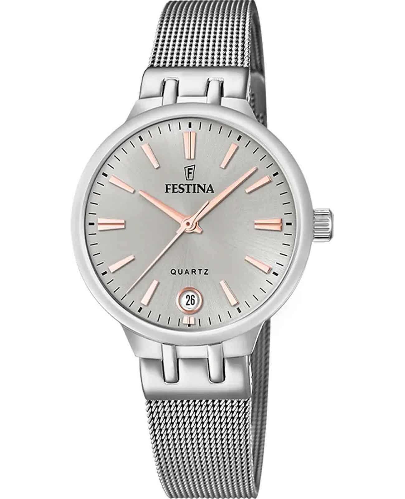 Часы Festina Mademoiselle F20712/1 для женщин представляют собой гармоничное сочетание современного стиля и функциональности. Эти часы имеют корпус из нержавеющей стали серебристого цвета шириной 33 мм, который придает изделию элегантный и утонченный вид. Серебристый циферблат защищен сапфировым стекломСапфировое стеклоПрочный и надёжный материал из кристалла сапфира синтетического происхождения, характеризующийся особой твёрдостью и устойчивостью к царапинам и повреждениям., что гарантирует устойчивость к царапинам и долговечность. Функция отображения даты, расположенная на отметке «6 часов», добавляет практичности и удобства в использовании. Водонепроницаемость на глубине до 50 метров обеспечивает защиту от незначительных брызг, делая эти часы надежными в повседневном использовании. Браслет из нержавеющей стали в миланском плетении с раскладным замкомРаскладной замокДанный вариант застежки используется только на часах с металлическим браслетом. Отличительная особенность такого крепления в том, что длина браслета становится универсальной и вы можете самостоятельно отрегулировать нужный вам размер – застежка просто двигается по браслету часов. также выполнен в серебристом цвете и прекрасно дополняет общий дизайн, создавая цельный и привлекательный образ.