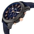 Рельефный черно-синий циферблат с накладными золотистыми часовыми метками и счетчиками хронографа.