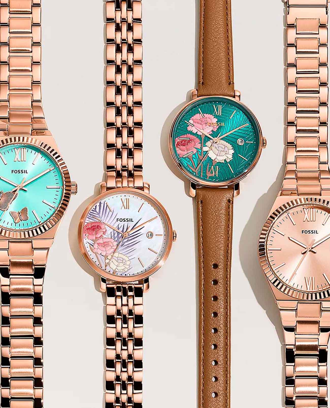 Женские американские часы с минеральным стекломМинеральное стеклоМинеральное стекло представляет собой искусственно выращенный минерал кварца. Такое стекло отличается особой устойчивостью к повреждениям и царапинам. Уступает по некоторым качествам сапфировому стеклу. Fossil Jacqueline ES5275, кварцевый механизм с высокой точностью. Корпус и браслет часов изготовлены из нержавеющей стали с IP-покрытиемIP-покрытиеМетод ионного напыления. Демонстрирует повышенную устойчивость к истиранию, окислению и химическим веществам. Под воздействием высокого давления и температуры около 1500°C молекулы металла надёжно соединяются с частицами корпуса часов.. Перламутровый циферблат украшен объемным изображением цветов. Метки в виде штрихов и римской цифры XII. Окошко даты находится в положении 3 часа. Рифленая заводная головка с защитой. Класс водозащиты: 30 метров, позволит защитить корпус от случайных брызг или капель дождя. Стальной браслет на раскладной застёжкеРаскладная застёжкаТакой тип застёжки используется только на браслетах из металла. Она никогда не раскрывается полностью, происходит разделение на 2 и более частей. Раскладывающая застёжка снизит вероятность потери часов к минимуму..