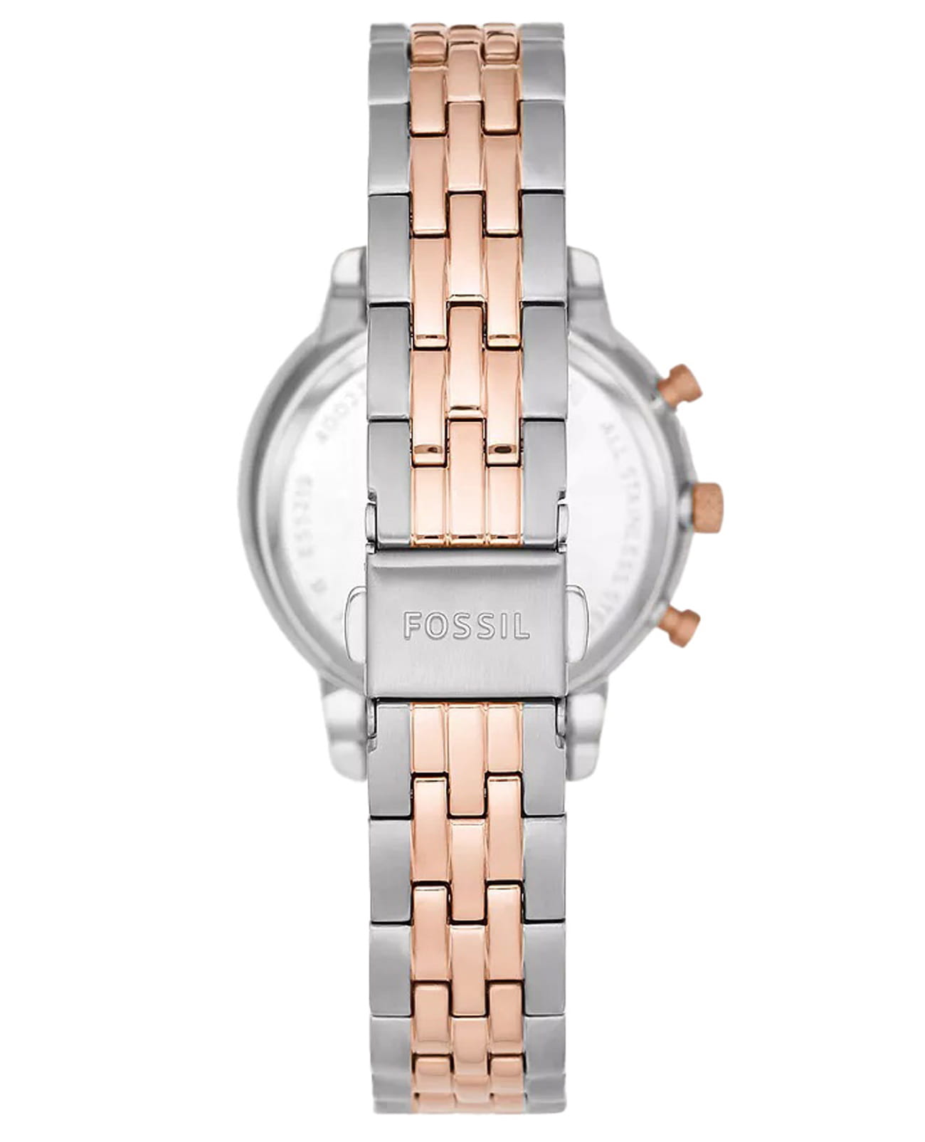 Женские американские часы-хронографХронографФункция позволяет измерять отрезки времени с особой точностью: часы, минуты, секунды. Верным признаком хронографа является наличие на циферблате 3 дополнительных окошек-счётчиков. с секундомеромСекундомерСекундоме́р — прибор, способный измерять интервалы времени с точностью до долей секунды. и с минеральным стекломМинеральное стеклоМинеральное стекло представляет собой искусственно выращенный минерал кварца. Такое стекло отличается особой устойчивостью к повреждениям и царапинам. Уступает по некоторым качествам сапфировому стеклу. Fossil Neutra ES5279, кварцевый механизм с высокой точностью. Корпус и браслет часов изготовлены из нержавеющей стали. БезельБезельВнешний ободок, закрепляющий стекло. В спортивных часах так называется поворотное кольцо с делениями на циферблате, выполняет роль таймера – замеряет отрезки времени на шкале. Неподвижный безель – элемент декора. Однонаправленно вращающийся безель на дайверских часах позволяет фиксировать моменты погружения и выныривания на поверхность. из нержавеющей стали с IP-покрытиемIP-покрытиеМетод ионного напыления. Демонстрирует повышенную устойчивость к истиранию, окислению и химическим веществам. Под воздействием высокого давления и температуры около 1500°C молекулы металла надёжно соединяются с частицами корпуса часов. украшен кристаллами. Окошко даты между 4 и 5 часами. Класс водозащиты: 50 метров, позволит защитить корпус от случайных брызг или капель дождя. Стальной браслет с частичным с IP-покрытиемIP-покрытиеМетод ионного напыления. Демонстрирует повышенную устойчивость к истиранию, окислению и химическим веществам. Под воздействием высокого давления и температуры около 1500°C молекулы металла надёжно соединяются с частицами корпуса часов. на раскладной застёжкеРаскладная застёжкаТакой тип застёжки используется только на браслетах из металла. Она никогда не раскрывается полностью, происходит разделение на 2 и более частей. Раскладывающая застёжка снизит вероятность потери часов к минимуму..