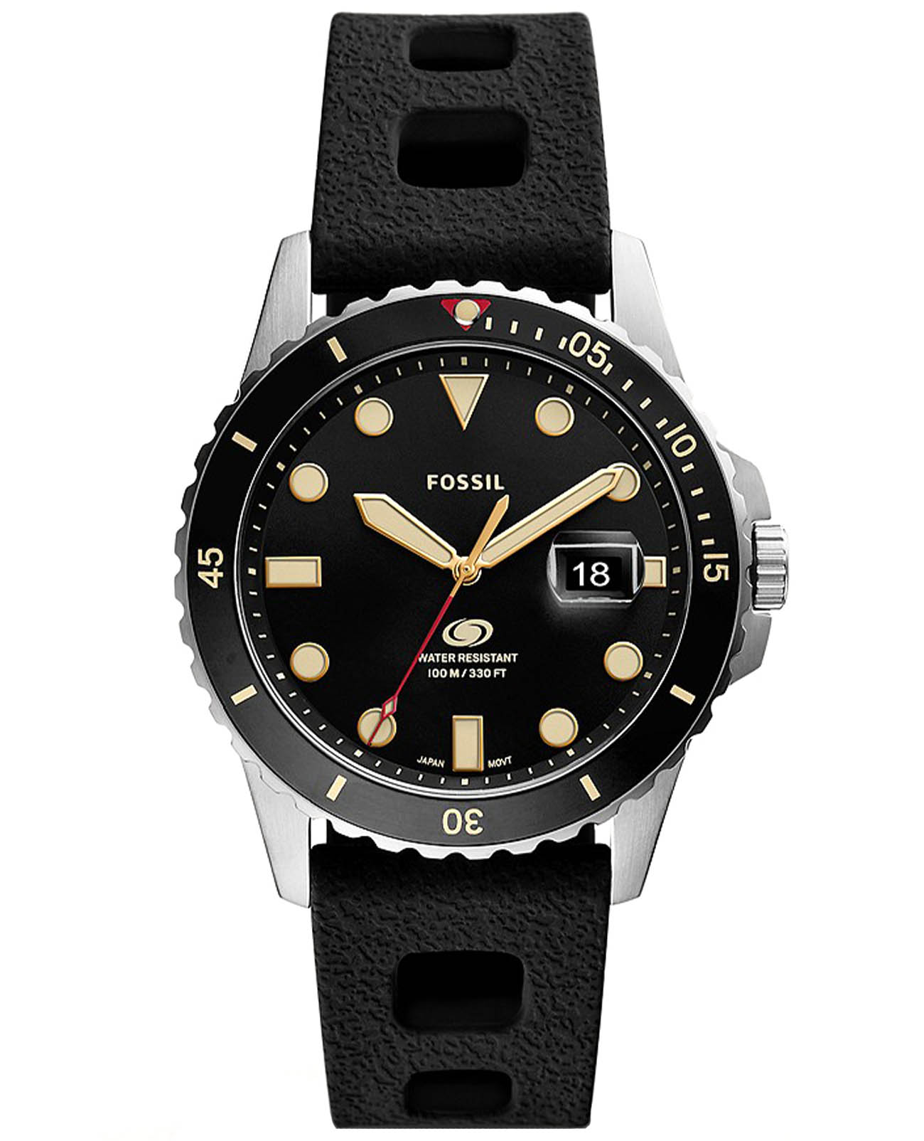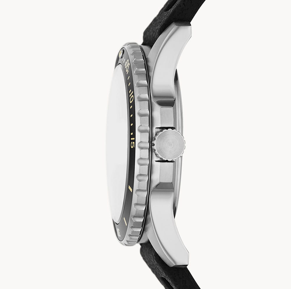 Мужские наручные часы с минеральным стекломМинеральное стеклоМинеральное стекло представляет собой искусственно выращенный минерал кварца. Такое стекло отличается особой устойчивостью к повреждениям и царапинам. Уступает по некоторым качествам сапфировому стеклу. Fossil Blue FS5947, кварцевый механизм с высокой точностью. Класс водозащиты: 100 метров, позволит плавать, нырять и заниматься другими водными видами спорта. Корпус часов изготовлен из стали. Метки в виде точек на циферблате и окошко даты находится в положении 3 часа. Силиконовый ремешок на стандартной застёжке. БезельБезельВнешний ободок, закрепляющий стекло. В спортивных часах так называется поворотное кольцо с делениями на циферблате, выполняет роль таймера – замеряет отрезки времени на шкале. Неподвижный безель – элемент декора. Однонаправленно вращающийся безель на дайверских часах позволяет фиксировать моменты погружения и выныривания на поверхность. с IP-покрытиемIP-покрытиеМетод ионного напыления. Демонстрирует повышенную устойчивость к истиранию, окислению и химическим веществам. Под воздействием высокого давления и температуры около 1500°C молекулы металла надёжно соединяются с частицами корпуса часов.. Стрелки и метки с люминесцентным покрытиемЛюминесцентное покрытиеПозволяет считывать показания времени в темноте. Производители наносят на стрелки, часовые индексы, безель или поверхность циферблата светонакопительный состав, дающий холодное свечение..