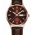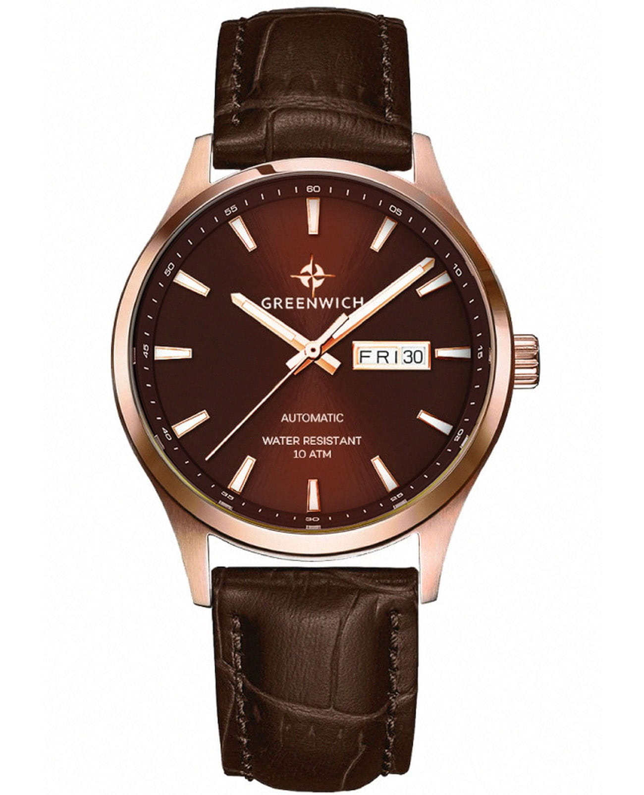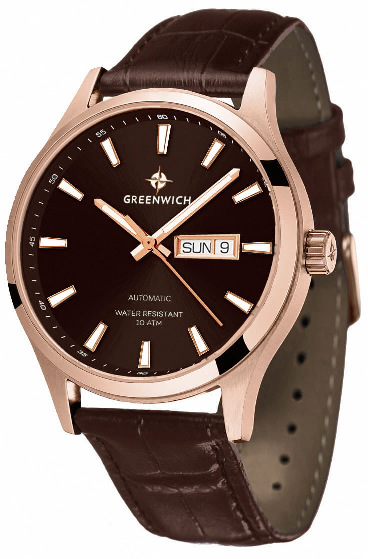 Часы Greenwich Good Luck GW 054.42.32 — это мужская модель, сочетающая элегантность и классический дизайн. Корпус диаметром 43 мм выполнен из нержавеющей стали с PVD-покрытиемPVDУльтратонкое покрытие наносится в технике вакуумного напыления, сочетает в себе нитрид титана особой прочности со слоем золота или оксида хрома. Несёт в себе декоративную или защитную функцию. из розового золота, сочетающим зеркальную полировку на безеле и матовую отделку на остальных частях корпуса. Коричневый циферблат с полировкой оснащён накладными часовыми метками и крупными стрелками с люминесцентным покрытием, обеспечивающим хорошую читаемость в условиях низкой освещённости. Циферблат защищён минеральным стекломМинеральное стеклоМинеральное стекло представляет собой искусственно выращенный минерал кварца. Такое стекло отличается особой устойчивостью к повреждениям и царапинам. Уступает по некоторым качествам сапфировому стеклу.. Модель оснащена автоматическим механизмом TMI с функциями отображения даты и дня недели. Запас хода составляет около 40 часов. Прозрачная задняя крышка позволяет наблюдать за работой механизма, на роторе которого выгравирован силуэт парусника — символ английских мореходов и название серии. Водозащита до 10 атмосфер (100 метров) делает часы подходящими для плавания и других водных активностей. Ремешок из натуральной коричневой кожи с прошивкой обеспечивает комфортное ношение и надёжную фиксацию на запястье. Эта модель идеально подойдёт для тех, кто ценит сочетание классического стиля и современных технологий.