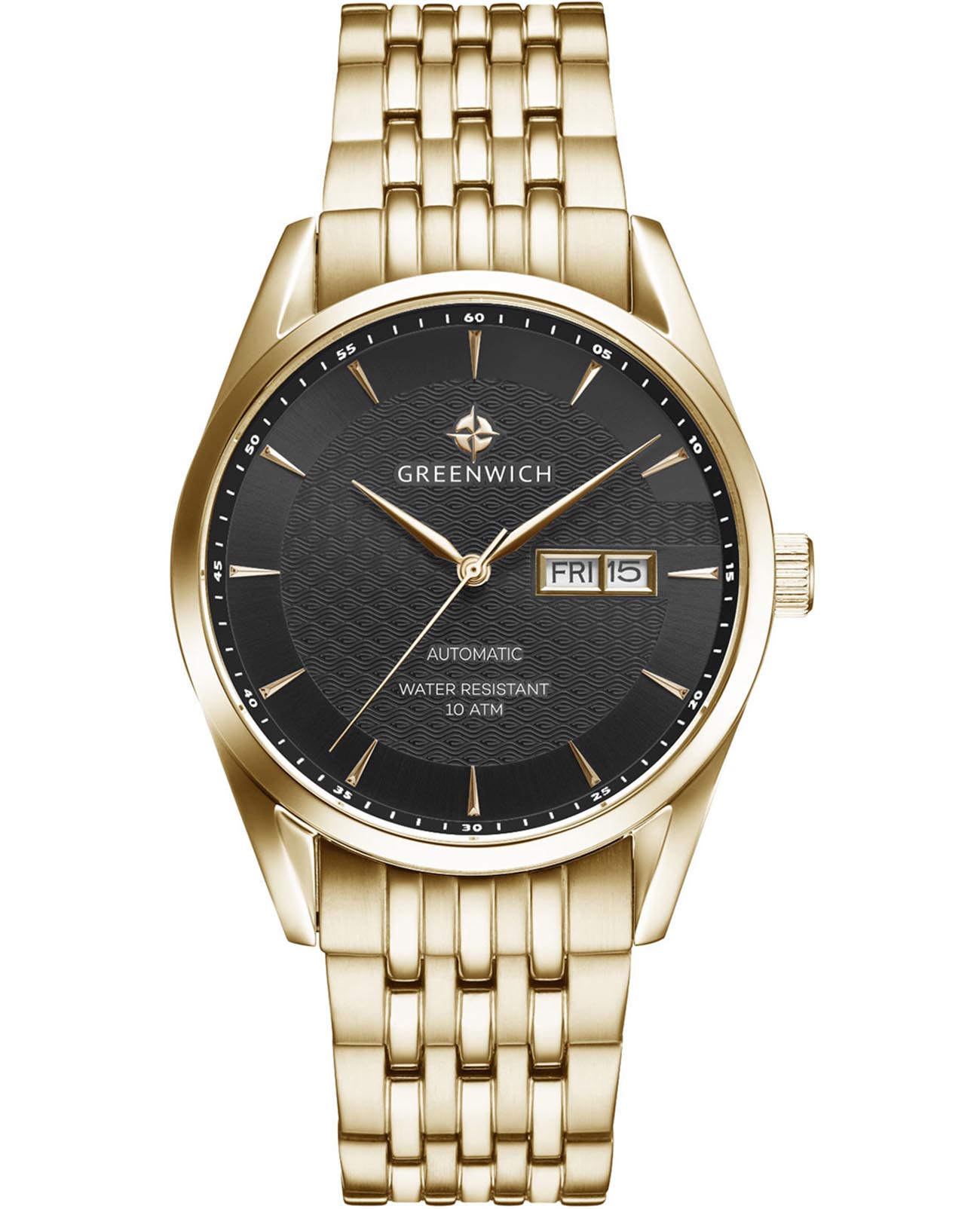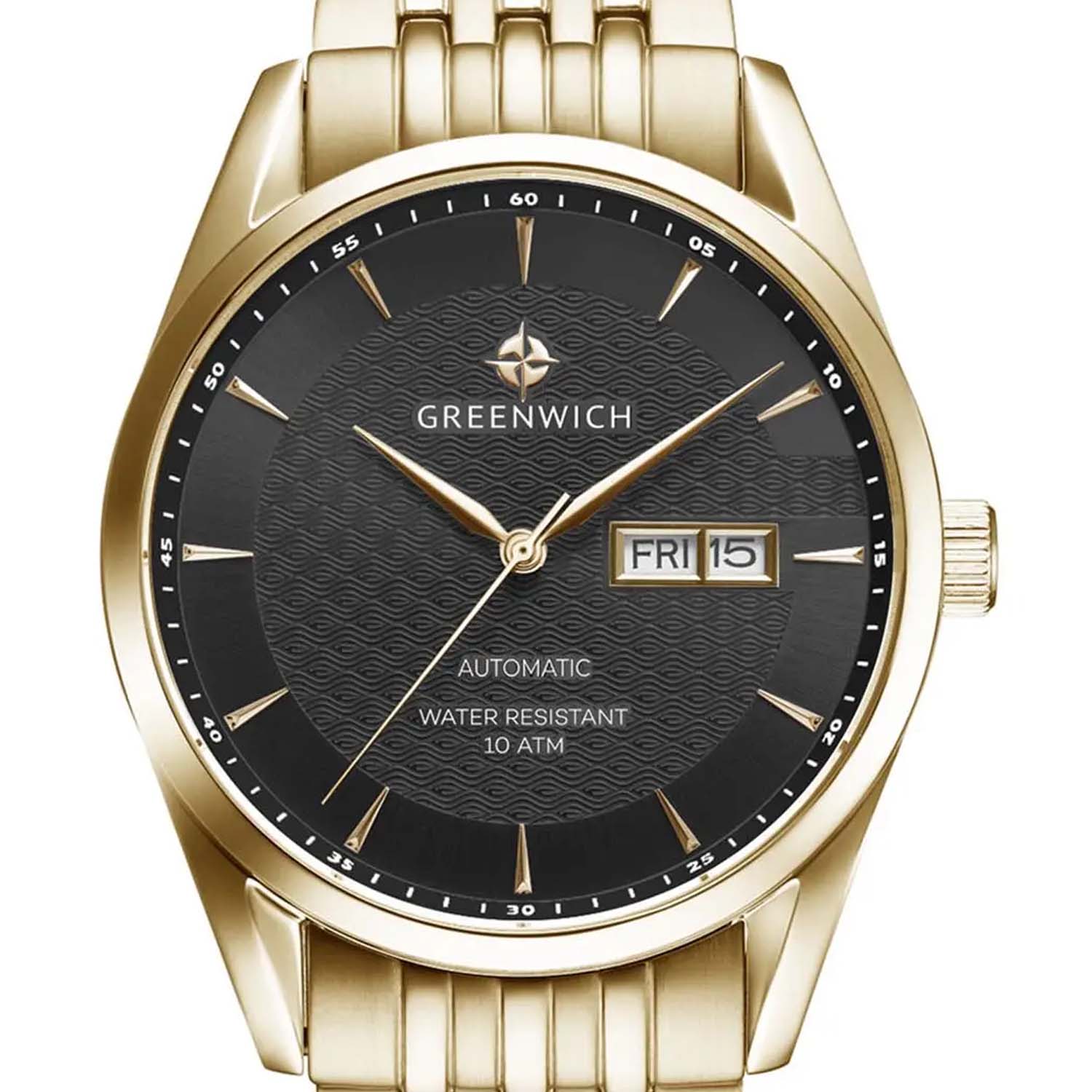 Мужские часы с минеральным стекломМинеральное стеклоМинеральное стекло представляет собой искусственно выращенный минерал кварца. Такое стекло отличается особой устойчивостью к повреждениям и царапинам. Уступает по некоторым качествам сапфировому стеклу. Greenwich Good Luck Classic GW 074.20.31, представляют собой классический вариант для повседневной носки. В центральной части циферблата — отличительная черта моделей этой серии: гильоше, объемные линии которого напоминают волны. Обратите внимание на форму пластины, где крепятся накладные риски: она сделана в форме латинской буквы G, первой буквы в названии бренда. Часы характеризуются традиционными формами, лаконичным исполнением, что делает модель элегантным дополнением к деловому костюму. Сквозь прозрачную заднюю крышку вы увидите детали механизма TMI с декорированным ротором: на нем выгравировано изображение символа английских моряков — парусника. Корпус и браслет часов выполнены из гипоаллергенной нержавеющей стали с PVD-покрытиемPVDУльтратонкое покрытие наносится в технике вакуумного напыления, сочетает в себе нитрид титана особой прочности со слоем золота или оксида хрома. Несёт в себе декоративную или защитную функцию.. Браслет на раскладной застёжкеРаскладная застёжкаТакой тип застёжки используется только на браслетах из металла. Она никогда не раскрывается полностью, происходит разделение на 2 и более частей. Раскладывающая застёжка снизит вероятность потери часов к минимуму.. Дизайн, актуальный для любого современного образа, и надежность используемых материалов делают автоматические часы Greenwich удобным и стильным аксессуаром на каждый день. Окошко даты и дня недели находится в положении 3 часа. Класс водозащиты: 100 метров, позволит плавать, нырять и заниматься другими водными видами спорта.