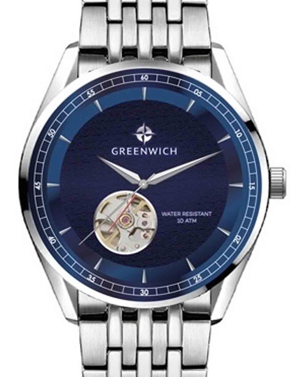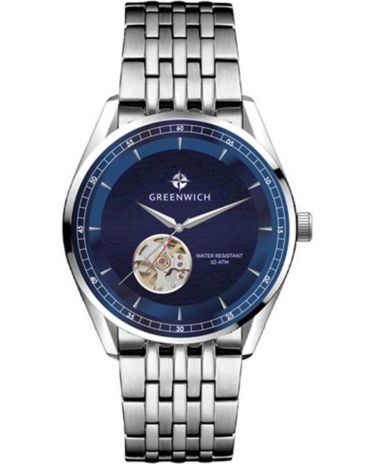 Мужские механические часы с минеральным стекломМинеральное стеклоМинеральное стекло представляет собой искусственно выращенный минерал кварца. Такое стекло отличается особой устойчивостью к повреждениям и царапинам. Уступает по некоторым качествам сапфировому стеклу. Greenwich GW 075.10.36. Корпус часов изготовлен из стали. Класс водозащиты: 100 метров, позволит плавать, нырять и заниматься другими водными видами спорта. Стальной браслет на раскладной застёжкеРаскладная застёжкаТакой тип застёжки используется только на браслетах из металла. Она никогда не раскрывается полностью, происходит разделение на 2 и более частей. Раскладывающая застёжка снизит вероятность потери часов к минимуму..