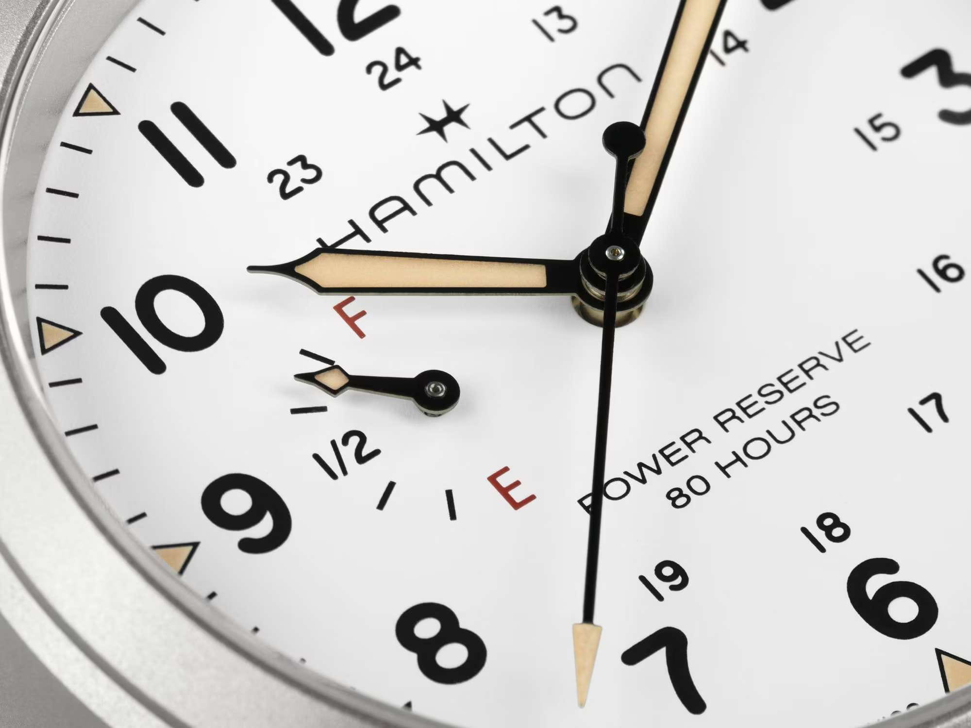 Мужские наручные часы Hamilton Khaki Field Mechanical Power Reserve 40mm H69509910 сочетают в себе спортивный стиль и элегантный дизайн. Модель обладает круглым корпусом диаметром 40 мм, изготовленным из нержавеющей стали, что обеспечивает высокую устойчивость к внешним воздействиям. Изысканный ремешок выполнен из ткани со стандартной застежкой, гарантирующей комфортное ношение и безопасность. Лаконичный циферблат оснащен крупными цифрами и стрелками с люминесцентным покрытиемЛюминесцентное покрытиеПозволяет считывать показания времени в темноте. Производители наносят на стрелки, часовые индексы, безель или поверхность циферблата светонакопительный состав, дающий холодное свечение. Super-LumiNova®, обеспечивающим превосходную видимость в темноте. Для защиты используется сапфировое стеклоСапфировое стеклоПрочный и надёжный материал из кристалла сапфира синтетического происхождения, характеризующийся особой твёрдостью и устойчивостью к царапинам и повреждениям., которое эффективно противостоит царапинам и имеет антибликовое покрытиеАнтибликовое покрытиеСлой оксида металла в 0,13-0,3 микрон, благодаря которому стекло часов не бликует и не отражает свет. Антибликовое покрытие уменьшает отражение света в 10 раз, обеспечивая отличную читаемость показателей циферблата.. Часы работают с помощью механизма H-23. Механизм с пружиной баланса Nivachron™Nivachron™Специально разработанный инновационный сплав Nivachron™ повышает устойчивость часов к воздействию магнитных полей. гарантирует точность хода, устойчивость к магнитным полям. На циферблате также буквы «F» для обозначения полного заряда и «E» для обозначения пустого заряда, что подчеркивает эту исключительную и практичную функцию. Водонепроницаемость часов достигает 10 атмосфер (100 метров), делающая их подходящими для повседневного использования и активного отдыха. Это сочетание высокой прочности, точности и изысканного дизайна для уверенных в себе мужчин.
