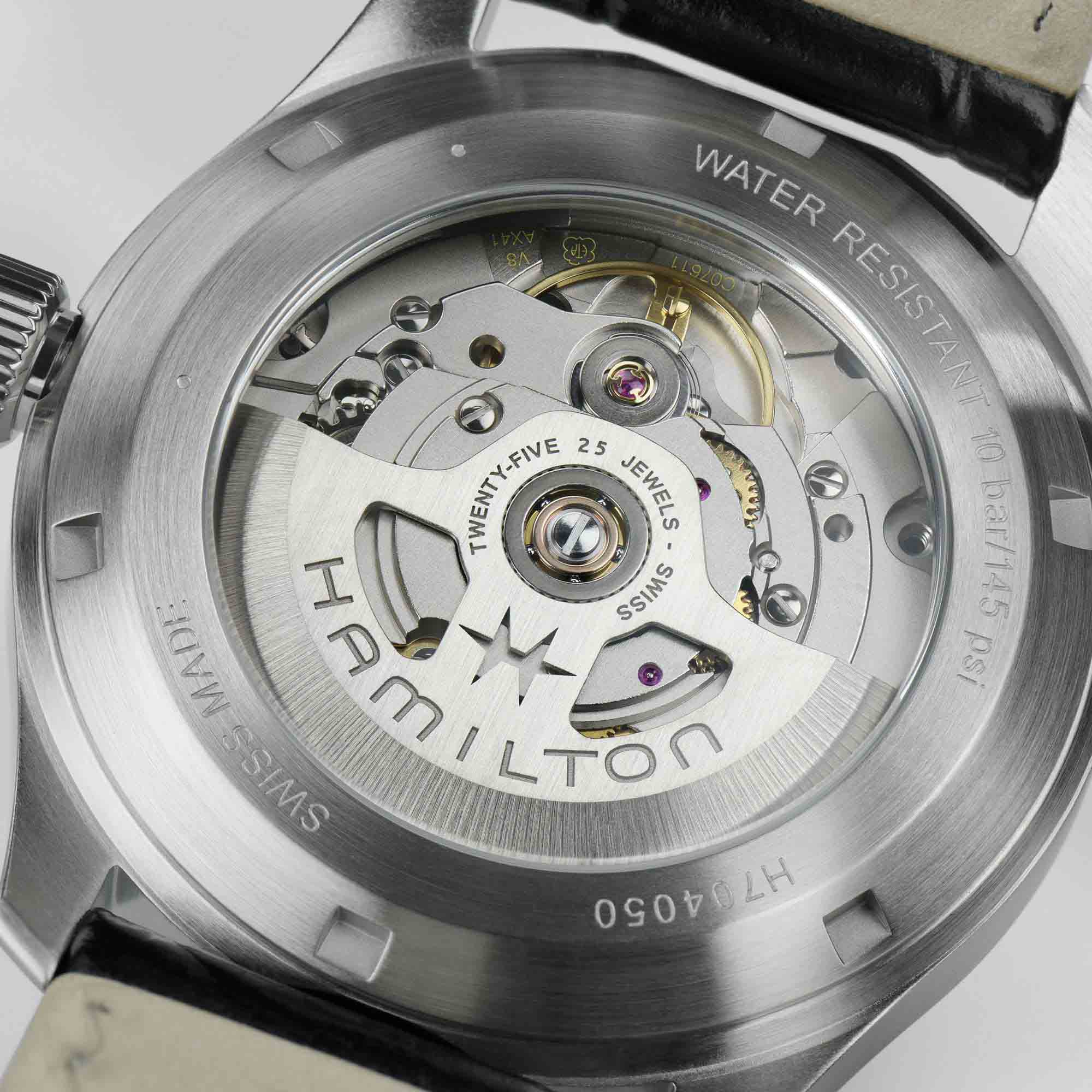 The Khaki Field Murph Auto. Одни из самых известных часов научной фантастики, известные поклонникам как "The Murphy", теперь заключены в компактный 38-миллиметровый корпус из нержавеющей стали. Ультрачитаемый черный циферблат, бежевые стрелки с люминесцентным покрытиемЛюминесцентное покрытиеПозволяет считывать показания времени в темноте. Производители наносят на стрелки, часовые индексы, безель или поверхность циферблата светонакопительный состав, дающий холодное свечение. Super-LumiNova ® в винтажном стиле и черный кожаный ремешок отражают ключевые эстетические коды своего 42-миллиметрового предшественника. Эти часы, оснащенные механизмом с автоподзаводом H-10 и обладающие 80-часовым запасом хода, покорят сердца тех, кто любит часы меньшего размера.