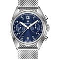 Мужские стильные швейцарские часы Hamilton Khaki Aviation Pilot Pioneer Mechanical Chronograph 40mm H76409140. Стальной корпус диаметром 40 мм и увеличенной толщиной 14,35 мм подчеркивает брутальность модели, а сапфировое стеклоСапфировое стеклоПрочный и надёжный материал из кристалла сапфира синтетического происхождения, характеризующийся особой твёрдостью и устойчивостью к царапинам и повреждениям. с антибликовым покрытиемАнтибликовое покрытиеСлой оксида металла в 0,13-0,3 микрон, благодаря которому стекло часов не бликует и не отражает свет. Антибликовое покрытие уменьшает отражение света в 10 раз, обеспечивая отличную читаемость показателей циферблата. обеспечивает превосходную читаемость матового синего циферблата со стрелками с люминесцентным покрытиемЛюминесцентное покрытиеПозволяет считывать показания времени в темноте. Производители наносят на стрелки, часовые индексы, безель или поверхность циферблата светонакопительный состав, дающий холодное свечение. Super-LumiNova®. Модель оснащена функцией хронографаХронографФункция позволяет измерять отрезки времени с особой точностью: часы, минуты, секунды. Верным признаком хронографа является наличие на циферблате 3 дополнительных окошек-счётчиков.. Механизм с ручным заводом H-51 оснащен кремниевой спиралью, обеспечивающей запас хода 60 часов и устойчивость к магнитным полям.  Модель укомплектована браслетом миланского плетения из нержавеющей стали с раскладным замкомРаскладной замокДанный вариант застежки используется только на часах с металлическим браслетом. Отличительная особенность такого крепления в том, что длина браслета становится универсальной и вы можете самостоятельно отрегулировать нужный вам размер – застежка просто двигается по браслету часов., обеспечивающий надёжную посадку. Водонепроницаемость часов достигает 10 атмосфер (100 метров), делающая их подходящими для повседневного использования и активного отдыха. Это сочетание высокой прочности, точности и изысканного дизайна для уверенных в себе мужчин.