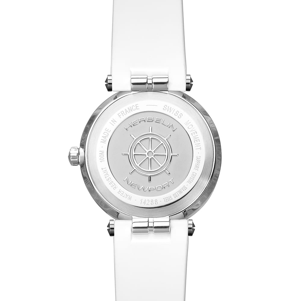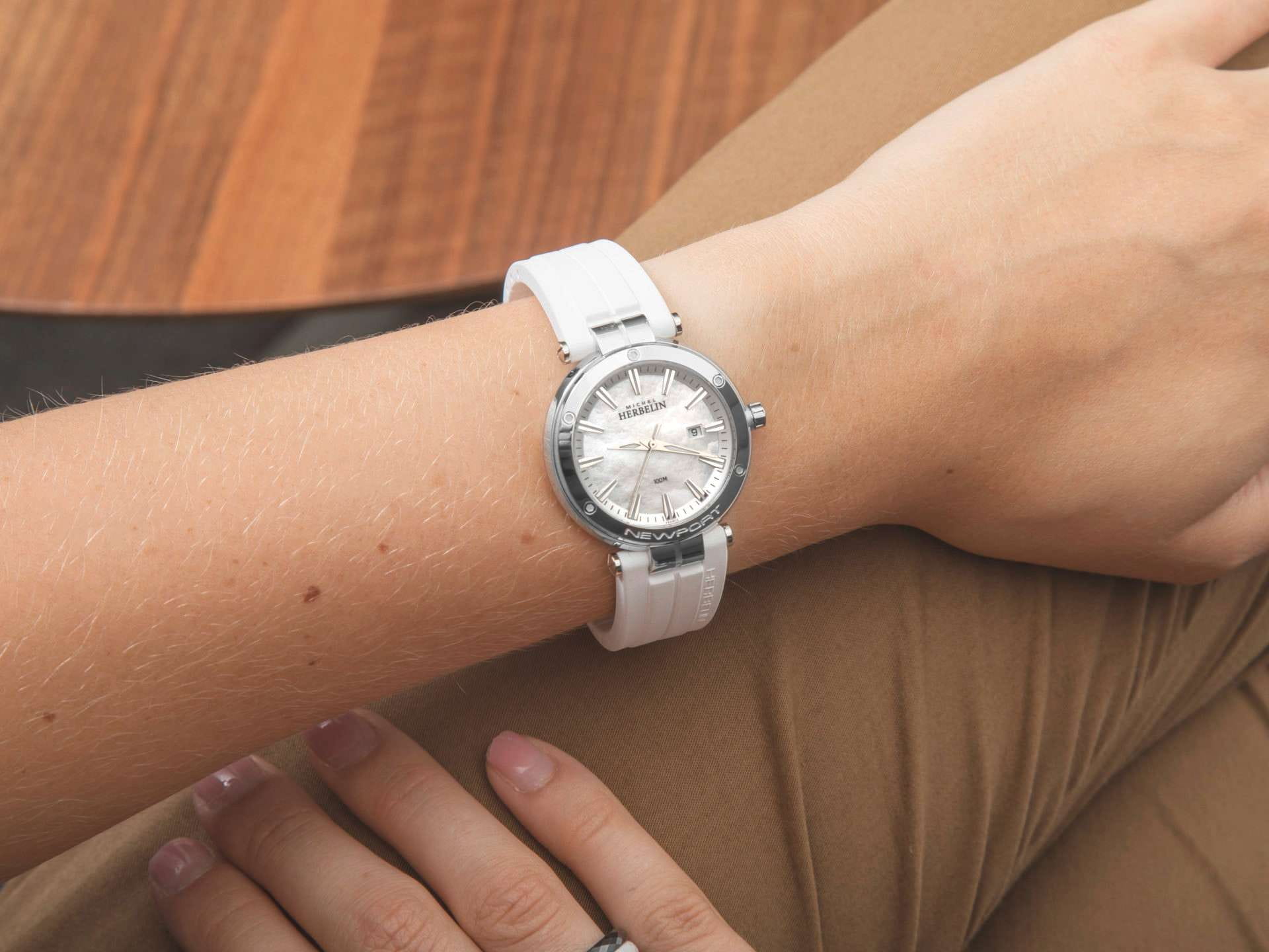 Женские кварцевые часы Herbelin Newport 14288AP19CW – отражающий идеальное сочетание современного дизайна, надёжности и функциональности. Элегантный облик станет превосходным завершением образа, наделив его индивидуальным характером. Корпус из нержавеющей стали серебристого цвета, диаметром 34.5 мм и толщиной 7.9 мм, идеально сбалансирован и элегантен. Сапфировое стеклоСапфировое стеклоПрочный и надёжный материал из кристалла сапфира синтетического происхождения, характеризующийся особой твёрдостью и устойчивостью к царапинам и повреждениям. защищает циферблат от царапин и устойчивое к механическим повреждениям. БезельБезельВнешний ободок, закрепляющий стекло. В спортивных часах так называется поворотное кольцо с делениями на циферблате, выполняет роль таймера – замеряет отрезки времени на шкале. Неподвижный безель – элемент декора. Однонаправленно вращающийся безель на дайверских часах позволяет фиксировать моменты погружения и выныривания на поверхность. украшен винтами, заводная головка с защитой. Окошко даты находится в положении 3 часа. Стрелки и метки с люминесцентным покрытиемЛюминесцентное покрытиеПозволяет считывать показания времени в темноте. Производители наносят на стрелки, часовые индексы, безель или поверхность циферблата светонакопительный состав, дающий холодное свечение.. Белый каучуковый ремешок на застёжке-бабочке с кнопкамиЗастёжка "бабочка"Такой вид застёжки дополняется предохранителями, помогающими избежать случайного раскрытия браслета. Обладают изящным исполнением. обеспечивает комфортное ношение. Водозащита 100 метров позволит плавать, нырять и заниматься другими водными видами спорта. Эта модель – отличный выбор для тех, кто ищет сочетание стиля, качества и функциональности. Часы станут не только полезным аксессуаром, но и выразительным элементом вашего имиджа.