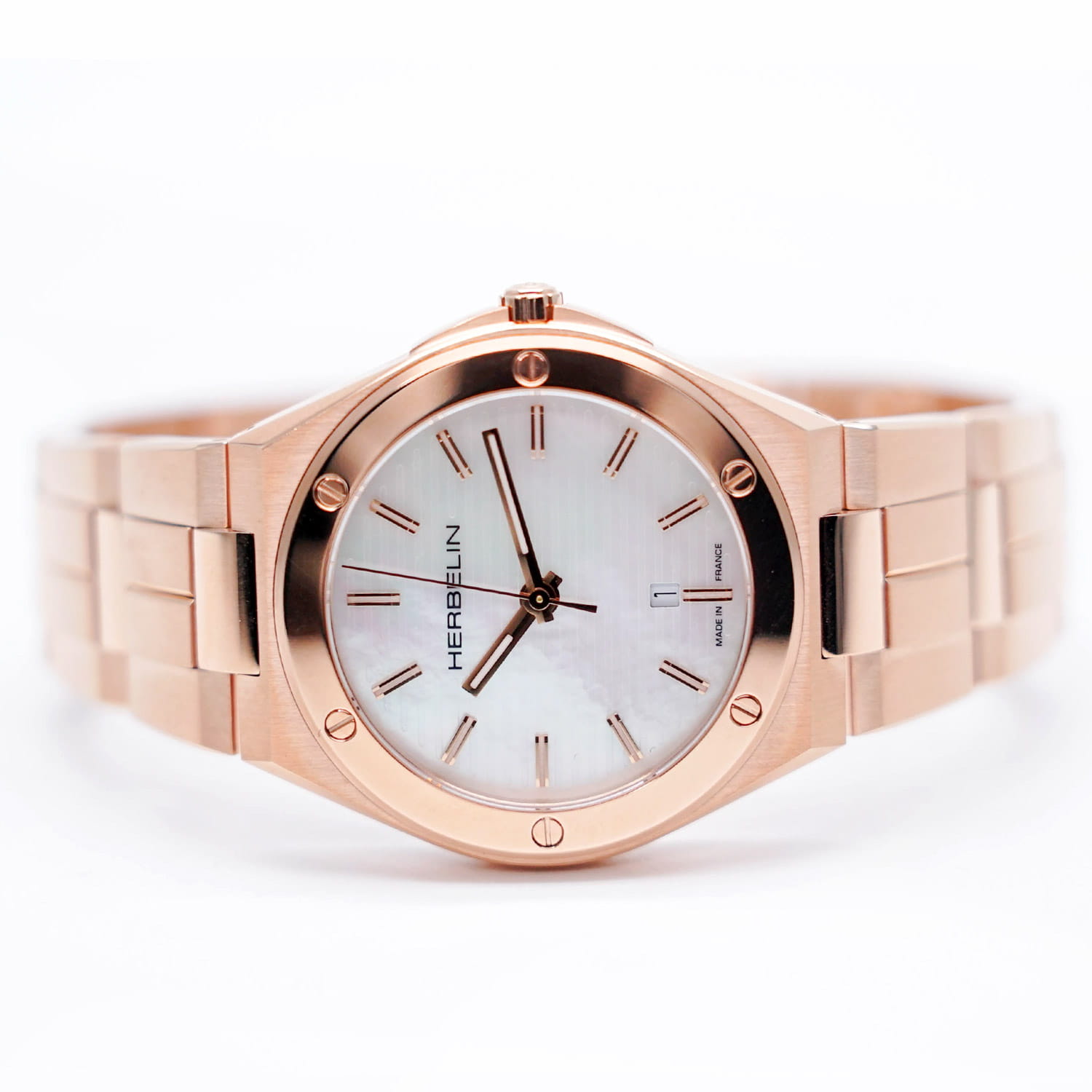 Женские кварцевые часы Herbelin Cap Camarat 14545BPR19 – отражающий идеальное сочетание современного дизайна, надёжности и функциональности. Элегантный облик станет превосходным завершением образа, наделив его индивидуальным характером. Корпус из нержавеющей стали с PVD-покрытиемPVDУльтратонкое покрытие наносится в технике вакуумного напыления, сочетает в себе нитрид титана особой прочности со слоем золота или оксида хрома. Несёт в себе декоративную или защитную функцию. цвета розового золота, диаметром 33 мм и толщиной 7.1 мм, идеально сбалансирован и элегантен. Сапфировое стеклоСапфировое стеклоПрочный и надёжный материал из кристалла сапфира синтетического происхождения, характеризующийся особой твёрдостью и устойчивостью к царапинам и повреждениям. защищает циферблат от царапин и устойчивое к механическим повреждениям. БезельБезельВнешний ободок, закрепляющий стекло. В спортивных часах так называется поворотное кольцо с делениями на циферблате, выполняет роль таймера – замеряет отрезки времени на шкале. Неподвижный безель – элемент декора. Однонаправленно вращающийся безель на дайверских часах позволяет фиксировать моменты погружения и выныривания на поверхность. украшен винтами, заводная головка с защитой. Окошко даты находится в положении 6 часов. Стрелки и метки с люминесцентным покрытиемЛюминесцентное покрытиеПозволяет считывать показания времени в темноте. Производители наносят на стрелки, часовые индексы, безель или поверхность циферблата светонакопительный состав, дающий холодное свечение.. Стальной браслет с PVD-покрытиемPVDУльтратонкое покрытие наносится в технике вакуумного напыления, сочетает в себе нитрид титана особой прочности со слоем золота или оксида хрома. Несёт в себе декоративную или защитную функцию. на застёжке-бабочке с кнопкамиЗастёжка "бабочка"Такой вид застёжки дополняется предохранителями, помогающими избежать случайного раскрытия браслета. Обладают изящным исполнением. обеспечивает комфортное ношение. Водозащита 100 метров позволит плавать, нырять и заниматься другими водными видами спорта. Эта модель – отличный выбор для тех, кто ищет сочетание стиля, качества и функциональности. Часы станут не только полезным аксессуаром, но и выразительным элементом вашего имиджа.