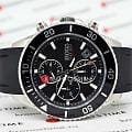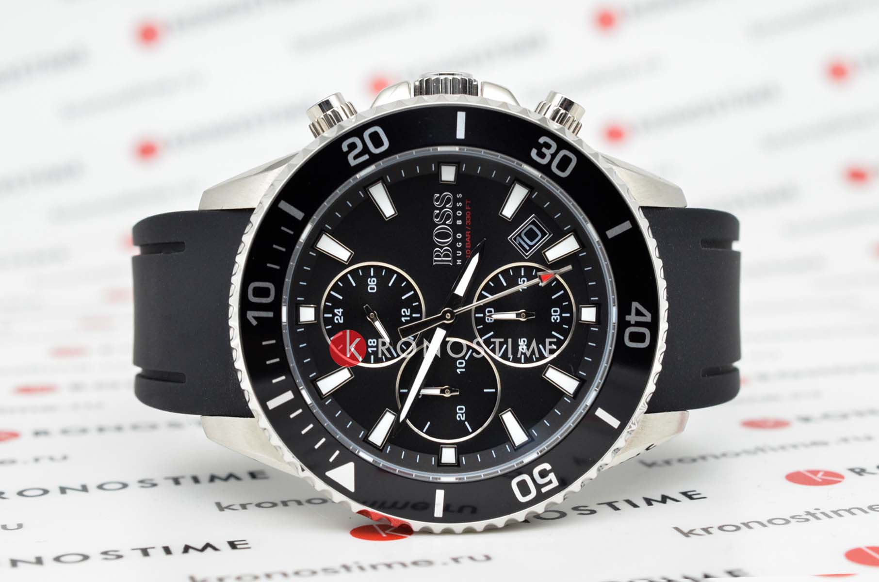Мужские часы Hugo Boss Admiral HB1513912 представлены в круглом 45-мм корпусе из нержавеющей стали 316L с IP-покрытиемIP-покрытиеМетод ионного напыления. Демонстрирует повышенную устойчивость к истиранию, окислению и химическим веществам. Под воздействием высокого давления и температуры около 1500°C молекулы металла надёжно соединяются с частицами корпуса часов.. Оснащены кварцевым механизмом с функциями хронографаХронографФункция позволяет измерять отрезки времени с особой точностью: часы, минуты, секунды. Верным признаком хронографа является наличие на циферблате 3 дополнительных окошек-счётчиков. и секундомеромСекундомерСекундоме́р — прибор, способный измерять интервалы времени с точностью до долей секунды.. Черный циферблат защищен устойчивым к царапинам минеральным стекломМинеральное стеклоМинеральное стекло представляет собой искусственно выращенный минерал кварца. Такое стекло отличается особой устойчивостью к повреждениям и царапинам. Уступает по некоторым качествам сапфировому стеклу.. Силиконовый ремешок черного цвета дополнен стандартной застежкой, а стрелки покрыты люминесцентным составомЛюминесцентное покрытиеПозволяет считывать показания времени в темноте. Производители наносят на стрелки, часовые индексы, безель или поверхность циферблата светонакопительный состав, дающий холодное свечение. для видимости в темноте. Водонепроницаемость 100 метров (10 ATM) позволяет использовать часы для плавания.