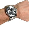 Циферблат защищен прочным минеральным стекломМинеральное стеклоМинеральное стекло представляет собой искусственно выращенный минерал кварца. Такое стекло отличается особой устойчивостью к повреждениям и царапинам. Уступает по некоторым качествам сапфировому стеклу. Flame Fusion, обладающим повышенной устойчивостью к царапинам и обеспечивающим четкую видимость показаний в любых условиях. Стальной браслет оснащен  раскладывающейся застежкойРаскладная застёжкаТакой тип застёжки используется только на браслетах из металла. Она никогда не раскрывается полностью, происходит разделение на 2 и более частей. Раскладывающая застёжка снизит вероятность потери часов к минимуму. с системой блокировки, которая обеспечивает комфортную фиксацию на запястье.