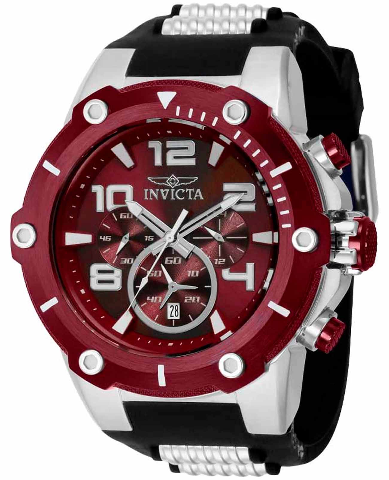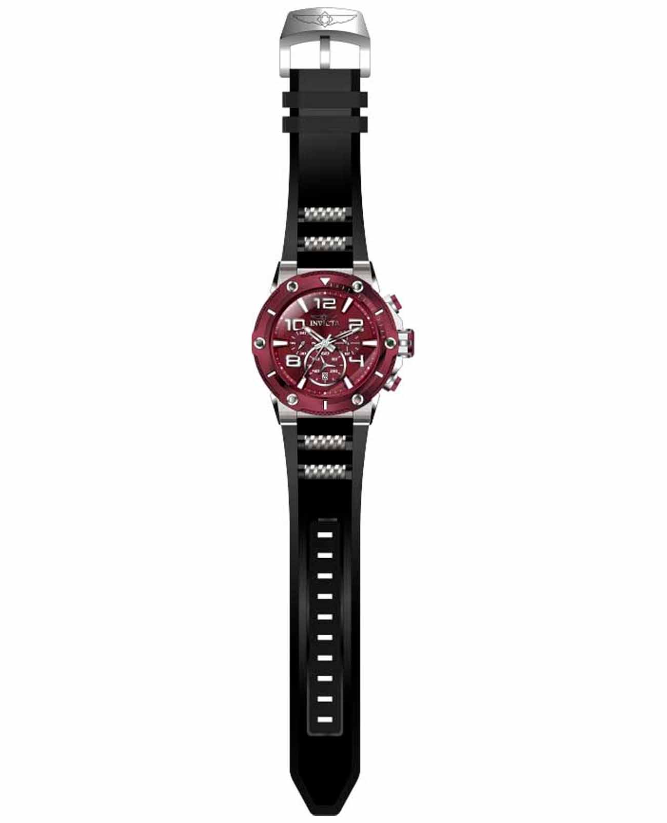 Мужские наручные часы-хронографХронографФункция позволяет измерять отрезки времени с особой точностью: часы, минуты, секунды. Верным признаком хронографа является наличие на циферблате 3 дополнительных окошек-счётчиков. Invicta IN40893 из коллекции Speedway сочетают в себе спортивный дизайн и надежность современных технологий. Модель обладает круглым корпусом, изготовленным из нержавеющей стали, что обеспечивает высокую устойчивость к внешним воздействиям . БезельБезельВнешний ободок, закрепляющий стекло. В спортивных часах так называется поворотное кольцо с делениями на циферблате, выполняет роль таймера – замеряет отрезки времени на шкале. Неподвижный безель – элемент декора. Однонаправленно вращающийся безель на дайверских часах позволяет фиксировать моменты погружения и выныривания на поверхность. с IP-покрытиемIP-покрытиеМетод ионного напыления. Демонстрирует повышенную устойчивость к истиранию, окислению и химическим веществам. Под воздействием высокого давления и температуры около 1500°C молекулы металла надёжно соединяются с частицами корпуса часов.. Ремешок оснащен классической застежкой, гарантирующей комфортное ношение и безопасность . Циферблат оснащен окном даты, расположенным в положении 6 часов, что делает их практичными для различных задач . Для защиты используется минеральное стеклоМинеральное стеклоМинеральное стекло представляет собой искусственно выращенный минерал кварца. Такое стекло отличается особой устойчивостью к повреждениям и царапинам. Уступает по некоторым качествам сапфировому стеклу., обеспечивающее прочную защиту от царапин . Часы работают на японском кварцевом механизме, что гарантирует точное время без необходимости подзаводки . Модель также является хронографомХронографФункция позволяет измерять отрезки времени с особой точностью: часы, минуты, секунды. Верным признаком хронографа является наличие на циферблате 3 дополнительных окошек-счётчиков., оснащенным функцией секундомераСекундомерСекундоме́р — прибор, способный измерять интервалы времени с точностью до долей секунды., что делает ее идеальной для активного образа жизни . Водонепроницаемость часов достигает 100 метров (10 атмосфер), что позволяет использовать их во время плавания и других водных видов спорта . Подсветка выполнена с использованием люминесцентного покрытияЛюминесцентное покрытиеПозволяет считывать показания времени в темноте. Производители наносят на стрелки, часовые индексы, безель или поверхность циферблата светонакопительный состав, дающий холодное свечение., что обеспечивает удобство использования в темное время суток .