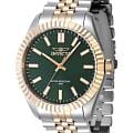 Мужские наручные часы Invicta Specialty IN47485 сочетают в себе классический дизайн и надежность современных технологий . Модель обладает круглым корпусом, выполненным из нержавеющей стали, что обеспечивает высокую устойчивость к внешним воздействиям. БезельБезельВнешний ободок, закрепляющий стекло. В спортивных часах так называется поворотное кольцо с делениями на циферблате, выполняет роль таймера – замеряет отрезки времени на шкале. Неподвижный безель – элемент декора. Однонаправленно вращающийся безель на дайверских часах позволяет фиксировать моменты погружения и выныривания на поверхность. с IP-покрытиемIP-покрытиеМетод ионного напыления. Демонстрирует повышенную устойчивость к истиранию, окислению и химическим веществам. Под воздействием высокого давления и температуры около 1500°C молекулы металла надёжно соединяются с частицами корпуса часов. украшен рифленой отделкой, придающей часам дополнительную элегантность. Браслет также изготовлен из нержавеющей стали с частичным IP-покрытиемIP-покрытиеМетод ионного напыления. Демонстрирует повышенную устойчивость к истиранию, окислению и химическим веществам. Под воздействием высокого давления и температуры около 1500°C молекулы металла надёжно соединяются с частицами корпуса часов. и оснащен раскладывающейся застежкойРаскладной замокДанный вариант застежки используется только на часах с металлическим браслетом. Отличительная особенность такого крепления в том, что длина браслета становится универсальной и вы можете самостоятельно отрегулировать нужный вам размер – застежка просто двигается по браслету часов., гарантирующей комфортное ношение и безопасность. Зеленый циферблат выполнен по технологии Sunray (солнечные лучи), что создает эффект игры света . Метки в виде штрихов и арабских цифр дополнены светящимися стрелками с люминесцентным покрытиемЛюминесцентное покрытиеПозволяет считывать показания времени в темноте. Производители наносят на стрелки, часовые индексы, безель или поверхность циферблата светонакопительный состав, дающий холодное свечение., обеспечивающими отличную видимость даже в темное время суток. Для защиты используется минеральное стеклоМинеральное стеклоМинеральное стекло представляет собой искусственно выращенный минерал кварца. Такое стекло отличается особой устойчивостью к повреждениям и царапинам. Уступает по некоторым качествам сапфировому стеклу., которое обеспечивает прочность и устойчивость к царапинам. Часы оснащены кварцевым механизмом, что гарантирует точность хода без необходимости подзаводки. Водонепроницаемость модели достигает 50 метров (5 атмосфер), что позволяет использовать их в повседневной жизни, включая контакт с водой, например, при мытье рук или дожде . Сочетание классического дизайна и функциональности делает эту модель универсальным аксессуаром для различных случаев жизни.