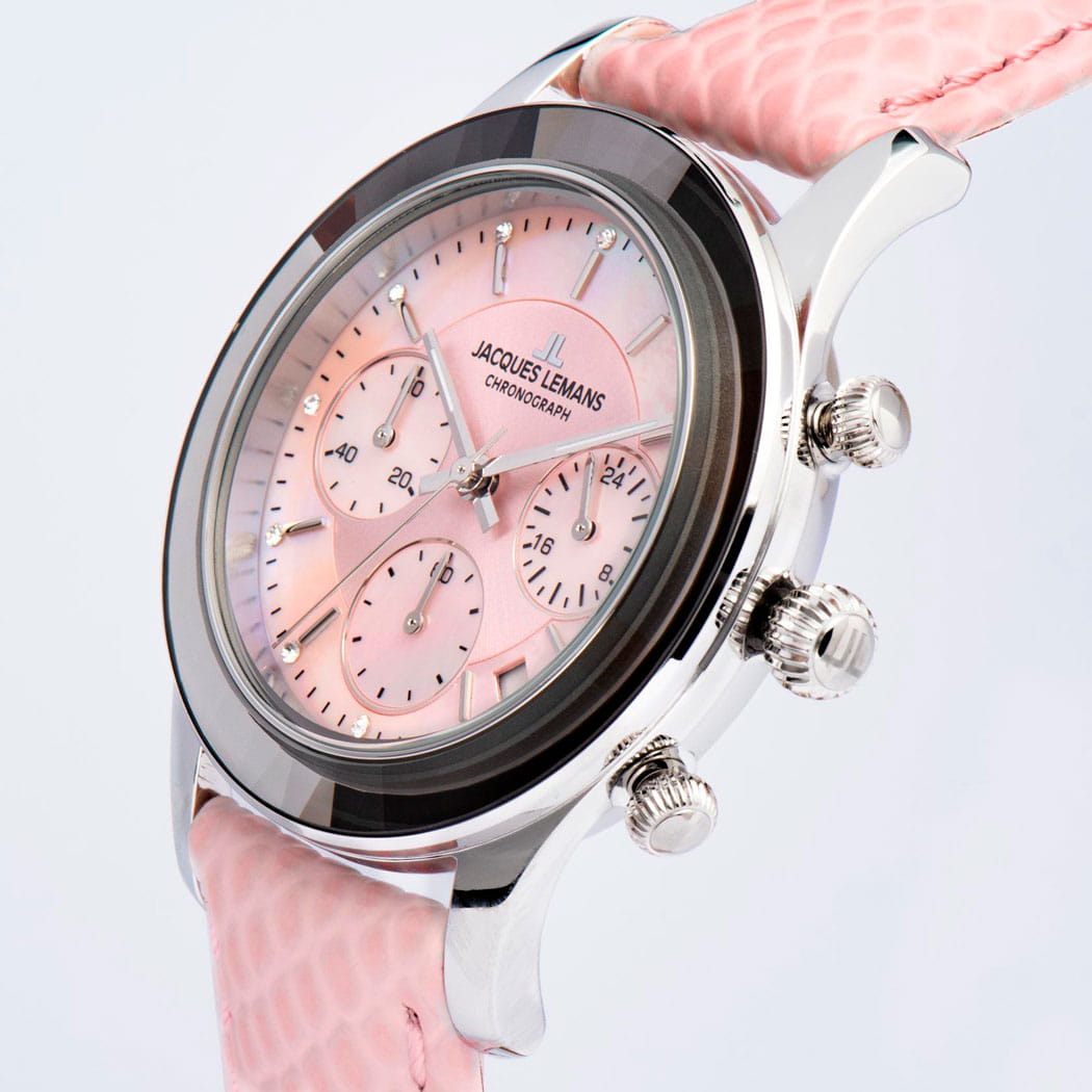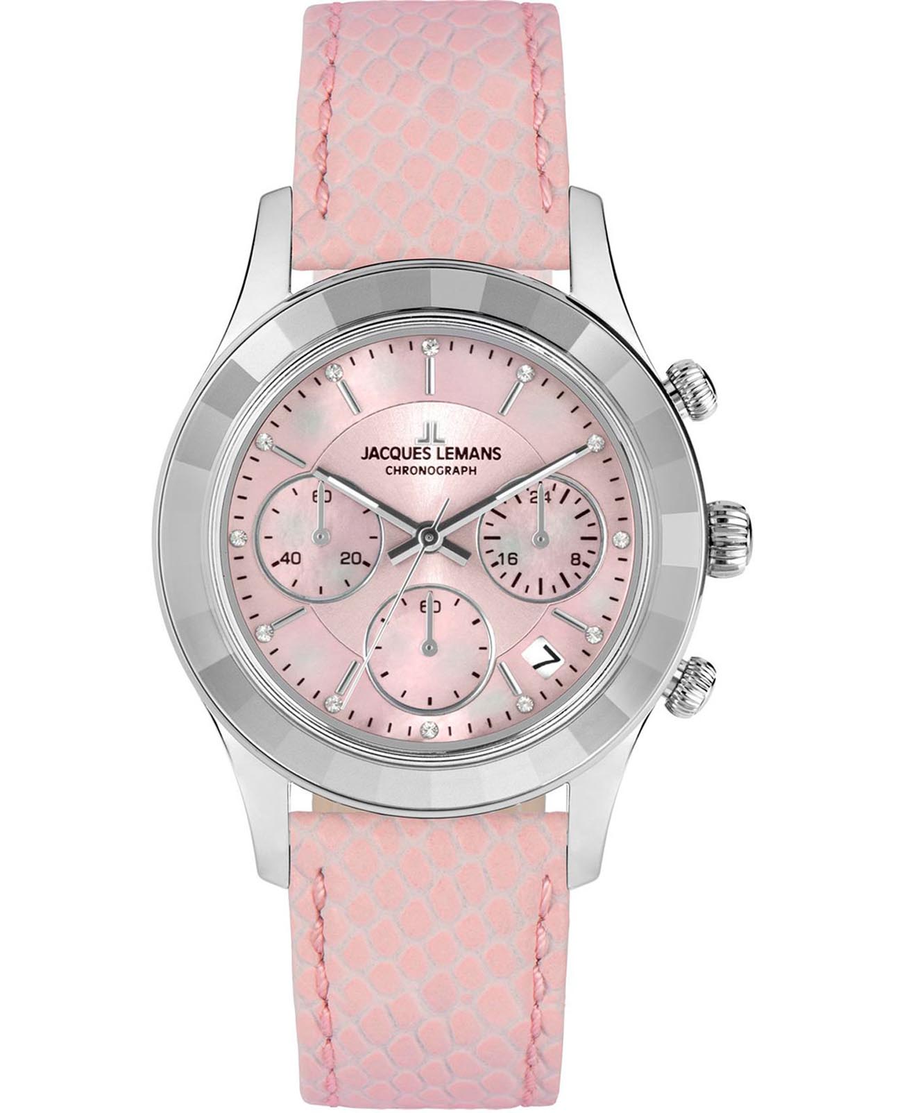 Женские часы Jacques Lemans Venice 1-2151D с минеральным стекломМинеральное стеклоМинеральное стекло представляет собой искусственно выращенный минерал кварца. Такое стекло отличается особой устойчивостью к повреждениям и царапинам. Уступает по некоторым качествам сапфировому стеклу., кварцевый механизм с высокой точностью. Часы- хронографХронографФункция позволяет измерять отрезки времени с особой точностью: часы, минуты, секунды. Верным признаком хронографа является наличие на циферблате 3 дополнительных окошек-счётчиков. с секундомеромСекундомерСекундоме́р — прибор, способный измерять интервалы времени с точностью до долей секунды.. БезельБезельВнешний ободок, закрепляющий стекло. В спортивных часах так называется поворотное кольцо с делениями на циферблате, выполняет роль таймера – замеряет отрезки времени на шкале. Неподвижный безель – элемент декора. Однонаправленно вращающийся безель на дайверских часах позволяет фиксировать моменты погружения и выныривания на поверхность. и корпус из нержавеющей стали. На циферблате расположены три дополнительных индикатора и окошко даты. Стрелки с люминесцентным покрытиемЛюминесцентное покрытиеПозволяет считывать показания времени в темноте. Производители наносят на стрелки, часовые индексы, безель или поверхность циферблата светонакопительный состав, дающий холодное свечение.. Каждая накладная риска украшена кристаллом Swarowski. Класс водозащиты: 50 метров, позволит защитить корпус от случайных брызг или капель дождя. Кожаный ремешок на стандартной застёжке.