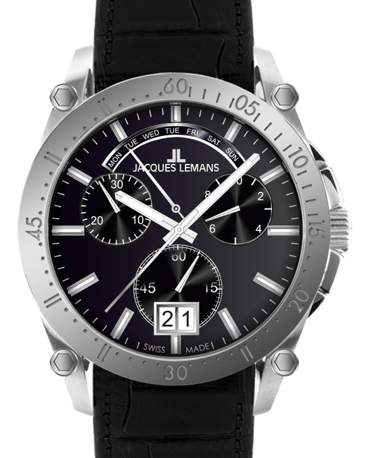 Мужские часы-хронографХронографФункция позволяет измерять отрезки времени с особой точностью: часы, минуты, секунды. Верным признаком хронографа является наличие на циферблате 3 дополнительных окошек-счётчиков. Jacques Lemans 1-2198A – лаконичная красота и изысканная элегантность. Оригинальная модель с классическим оформлением станет превосходным завершением образа, наделив его индивидуальным характером. Корпус выполнен из нержавеющей стали, диаметром 44 мм, что обеспечивает долговечность и утончённый внешний вид. Ударопрочное минеральное стеклоМинеральное стеклоМинеральное стекло представляет собой искусственно выращенный минерал кварца. Такое стекло отличается особой устойчивостью к повреждениям и царапинам. Уступает по некоторым качествам сапфировому стеклу. Crystex защищает циферблат от царапин. Кожаный ремешок на стандартной застёжке обеспечивает комфортное ношение. Водозащита 100 метров позволит плавать, нырять и заниматься другими водными видами спорта. Стрелки и метки с люминесцентным покрытиемЛюминесцентное покрытиеПозволяет считывать показания времени в темноте. Производители наносят на стрелки, часовые индексы, безель или поверхность циферблата светонакопительный состав, дающий холодное свечение. позволяющие легко определять время даже в темноте. Окошко даты находится в положении 6 часов. Широкое окошко дня недели в положении 12 часов позволяет показывать название дня недели. Это аксессуар для мужчины, который ценит классический стиль и функциональность.