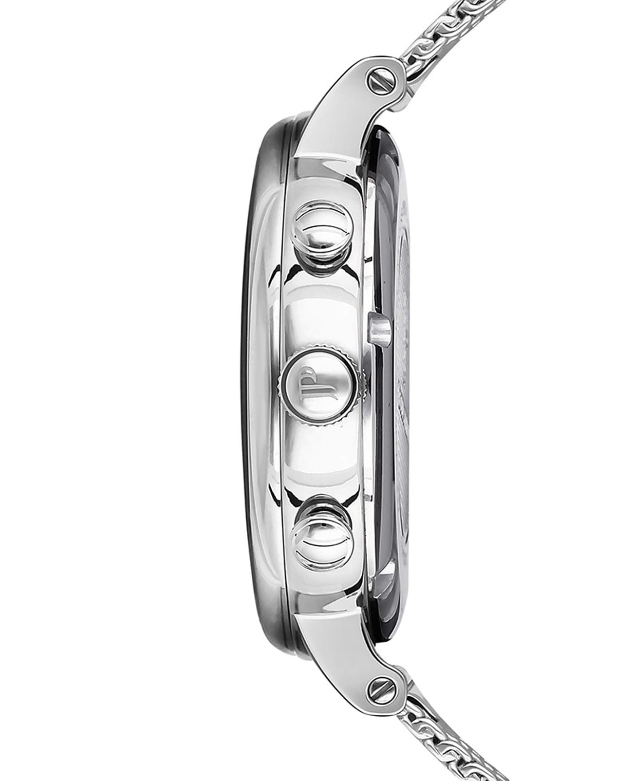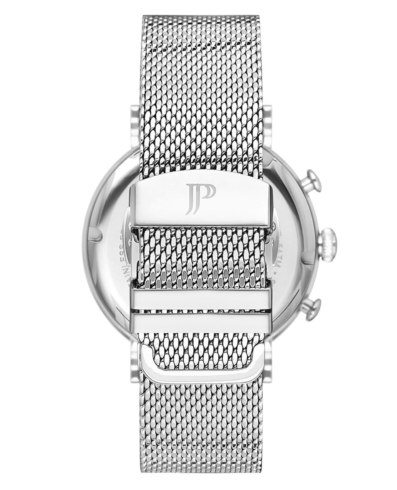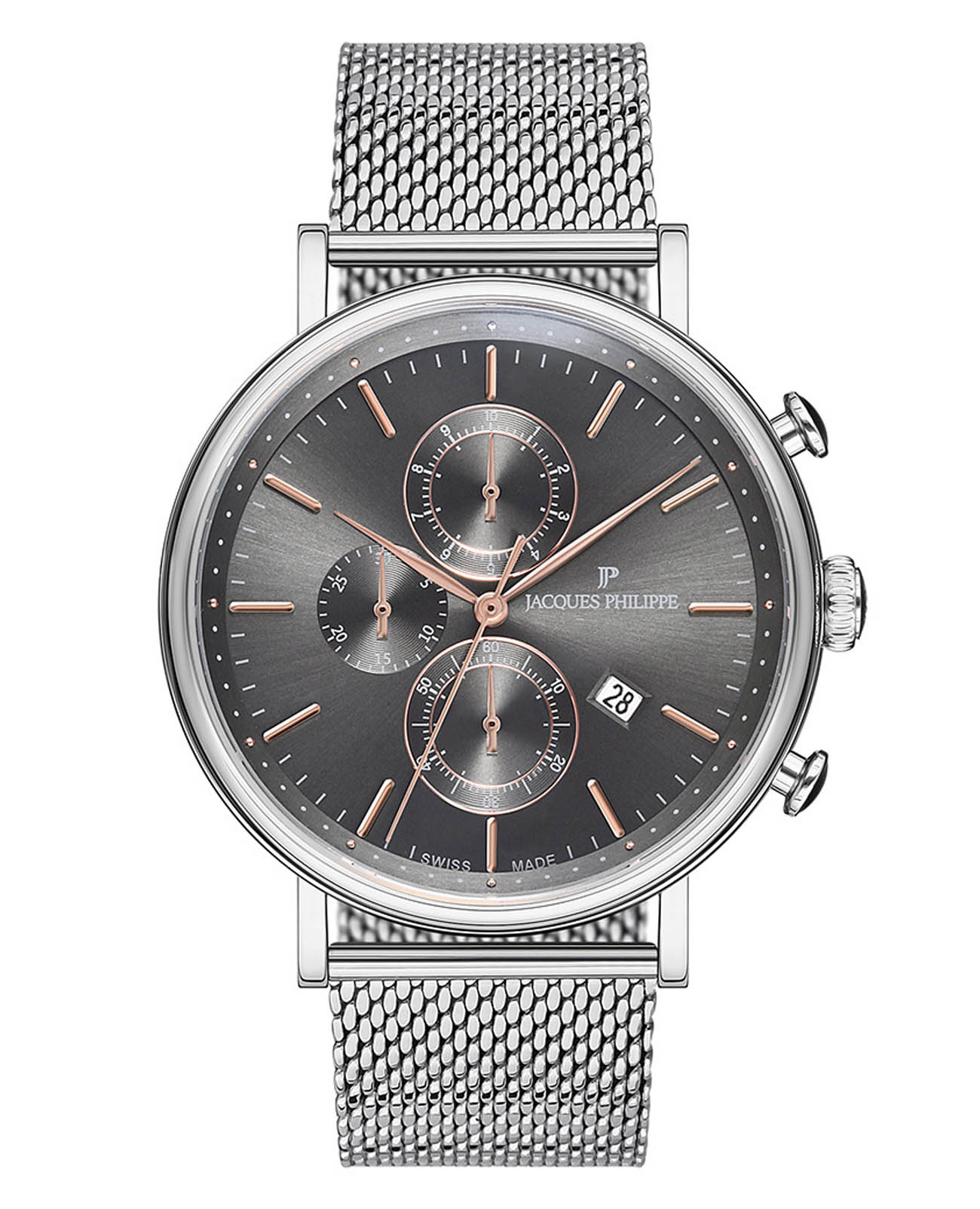 Швейцарские мужские часы-хронографХронографФункция позволяет измерять отрезки времени с особой точностью: часы, минуты, секунды. Верным признаком хронографа является наличие на циферблате 3 дополнительных окошек-счётчиков. Jacques Philippe Aviator JPQGC021246, кварцевый механизм с высокой точностью. Сапфировое стеклоСапфировое стеклоПрочный и надёжный материал из кристалла сапфира синтетического происхождения, характеризующийся особой твёрдостью и устойчивостью к царапинам и повреждениям. устойчивое к появлению царапин, обладающее высокой прозрачностью. Корпус часов изготовлен из нержавеющей стали. На циферблате три дополнительных индикатора. Окошко даты находится в положении 4 часов. Класс водозащиты: 50 метров, позволит защитить корпус от случайных брызг или капель дождя. Стальной браслет миланского плетения на раскладном замкеРаскладной замокДанный вариант застежки используется только на часах с металлическим браслетом. Отличительная особенность такого крепления в том, что длина браслета становится универсальной и вы можете самостоятельно отрегулировать нужный вам размер – застежка просто двигается по браслету часов..