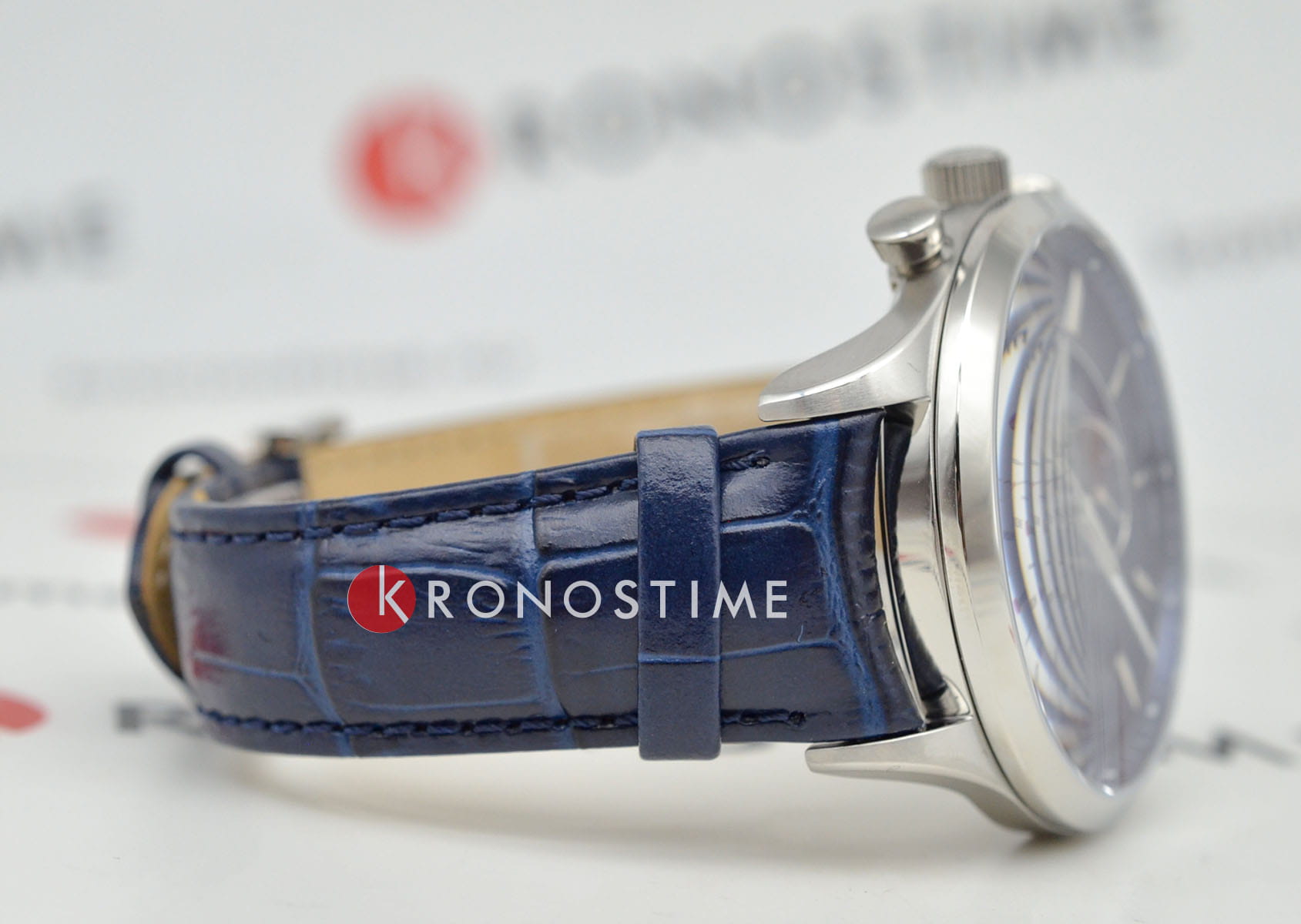 Водозащита 5 ATM защищает часы от брызг и дождя. Кожаный ремешок синего цвета с классической застёжкой обеспечивает комфортное ношение и надёжную фиксацию на запястье.