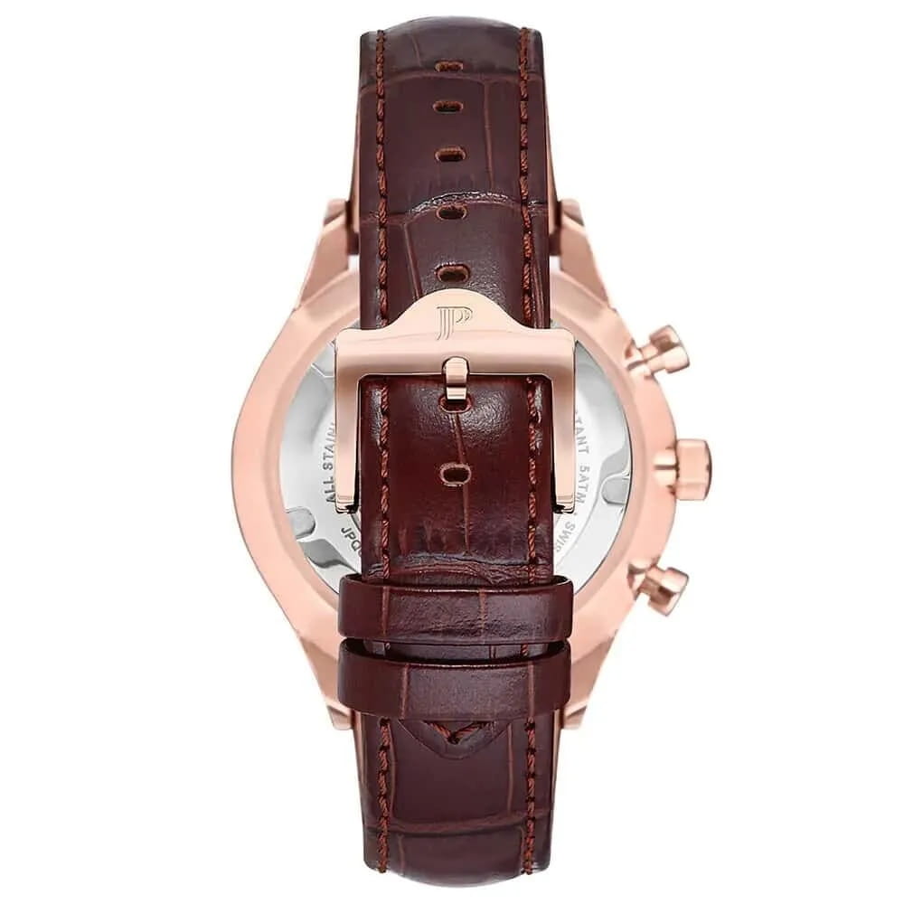 Швейцарские мужские часы-хронографХронографФункция позволяет измерять отрезки времени с особой точностью: часы, минуты, секунды. Верным признаком хронографа является наличие на циферблате 3 дополнительных окошек-счётчиков. Jacques Philippe Gallant JPQGC033123N кварцевый механизм с высокой точностью. Прочное сапфировое стеклоСапфировое стеклоПрочный и надёжный материал из кристалла сапфира синтетического происхождения, характеризующийся особой твёрдостью и устойчивостью к царапинам и повреждениям. устойчивое к появлению царапин, обладающее высокой прозрачностью. Циферблат украшен классическими стрелками с люминесцентным покрытиемЛюминесцентное покрытиеПозволяет считывать показания времени в темноте. Производители наносят на стрелки, часовые индексы, безель или поверхность циферблата светонакопительный состав, дающий холодное свечение., гармонично дополняющим общий дизайн модели. Элегантный корпус изготовлен из нержавеющей стали с IP-покрытиемIP-покрытиеМетод ионного напыления. Демонстрирует повышенную устойчивость к истиранию, окислению и химическим веществам. Под воздействием высокого давления и температуры около 1500°C молекулы металла надёжно соединяются с частицами корпуса часов., диаметром 43 мм, что делает их устойчивыми к внешним воздействиям и придает благородный вид. На циферблате три дополнительных индикатора. Кожаный ремешок на стандартной застёжке обеспечивает комфортное и безопасное ношение. Класс водозащиты: 50 метров позволит защитить корпус от случайных брызг или капель дождя. Эти часы станут идеальным выбором для мужчин, ценящих стиль, качество и функциональность.